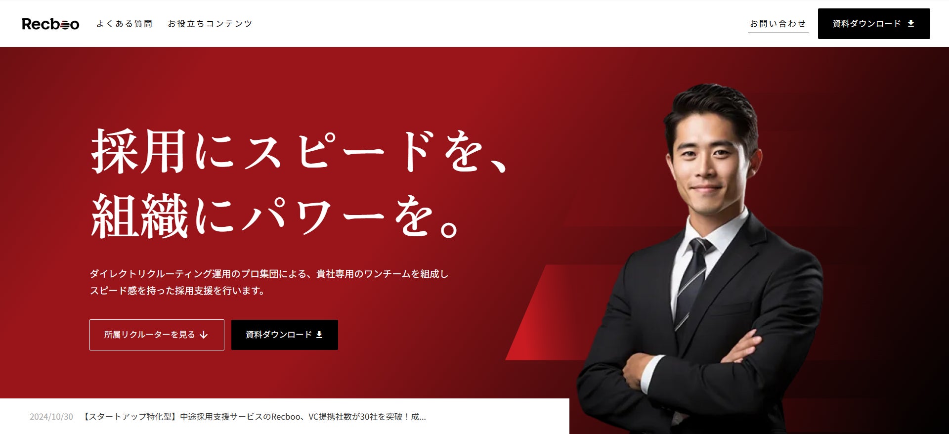 スタートアップ企業の採用力向上に特化した「Recboo」は、他の採用支援サービスと比較をしても、戦略立案からダイレクトリクルーティング、ハイレイヤー人材の採用に至るまで、専門家による一貫した支援が強みです。