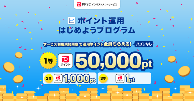 プログラム期間中、「ポイント運用」のサービス利用規約に同意された方全員を対象に、抽選で最大50,000ポイントの運用中残高をプレゼントします。