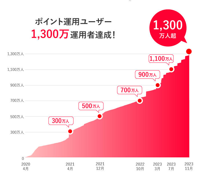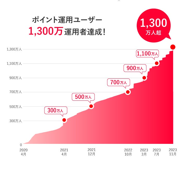 サービス提供開始から約3年となる2023年4月に1,000万人を突破し、その後もさらに多くの方にご利用いただいています。このたびの1,300万運用者突破は、ポイント運用サービスを提供する主要なポイント運用サービス取扱業者での業界最大規模をさらに更新しました(※3)。