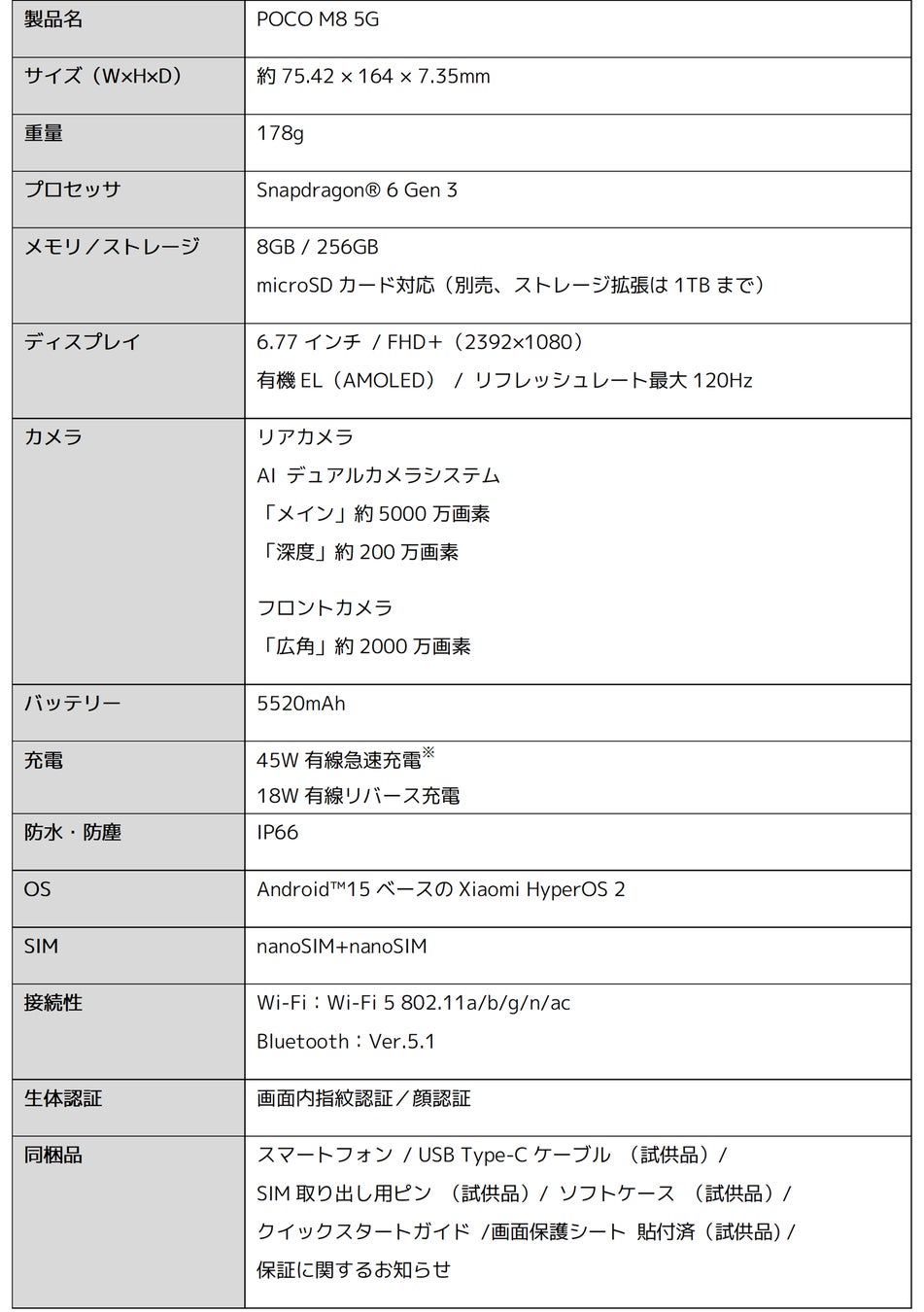 小米技術日本株式会社(以下「シャオミ・ジャパン」、本社:東京都港区)は、POCOブランドから「POCO M8 5G」を1月8日(木)より発売します。市場想定価格は36,980円(税込)です。