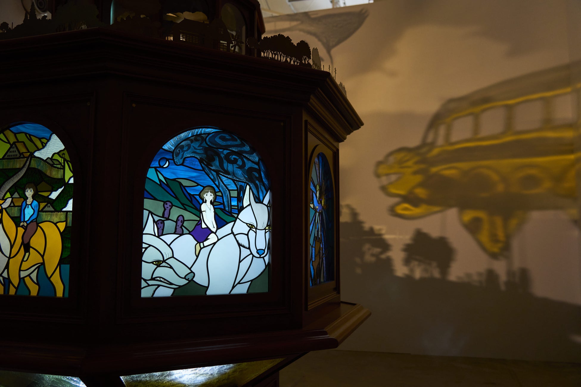 音と光に包まれる巨大な「ジブリの幻燈楼」が登場!「幻燈」とは、フィルムや造形物などに強い光を当てて、レンズで幕などに拡大映像を投影して見せることができる幻想的な装置。ガラスの町・富山の富山ガラス造形研究所、富山ガラス工房、地元作家らが制作を担当し、スタジオジブリが監修しました。キャラクターをモチーフとしたガラスに光を照射することで、映画の世界観を音と光に包まれながら体感できます。