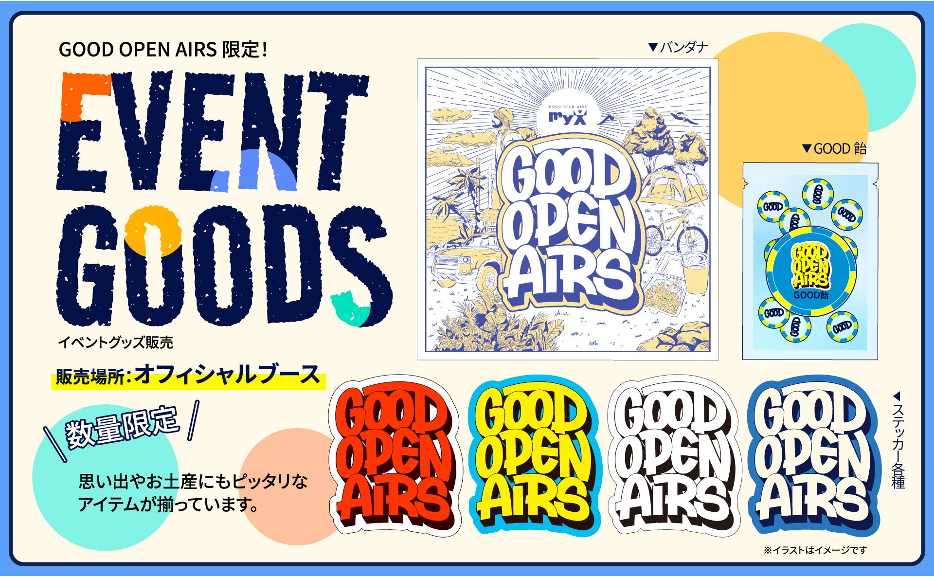 会場内のオフィシャルブースでは、数量限定でGOOD OPEN AIRSのオリジナルグッズを販売いたします。