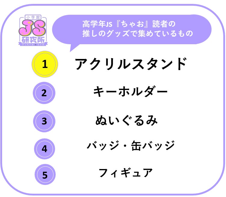 JSにとっての具体的な推し活は、「グッズ集め」と「テレビや配信を見る」が最多。中には友達と推し会を開いたり、コンサートやライブに行ったりする、という声もありました。「グッズ集め」について具体的に聞いたところ、「アクリルスタンド」を筆頭に「キーホルダー」、「ぬいぐるみ」に人気が集中。勉強机の上などお部屋に飾ったり、出かけ先に持っていって写真を撮影したりしているようです。