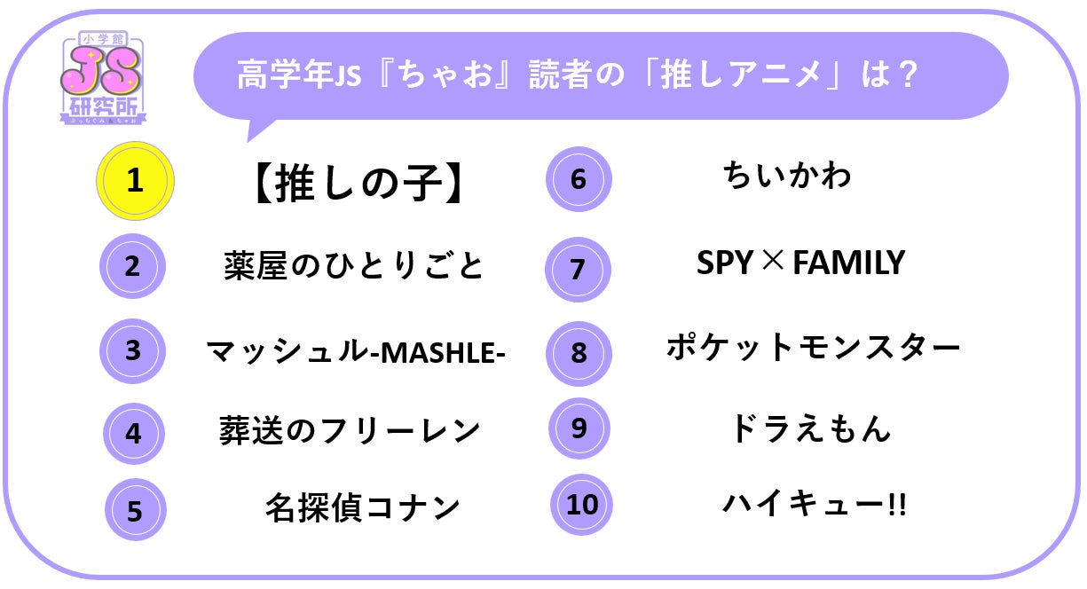 2024年5月号に掲載した読者アンケートでは、JSの今の『推しアニメ』についても調査しています。第1位は7月からテレビアニメで第2期の放映が予定されている「【推しの子】」でした。昨年9月に発表した「好きな曲」に関する調査結果(参考:https://prtimes.jp/main/html/rd/p/000000011.000104282.html )でも、「【推しの子】」の主題歌である『アイドル』(YOASOBI)がランクインしていることから、作品はもちろん、主題歌やSNSでの関連ダンス動画のブームなど、様々な要素が重なることで、JSから高い人気を獲得していることが推測できます。