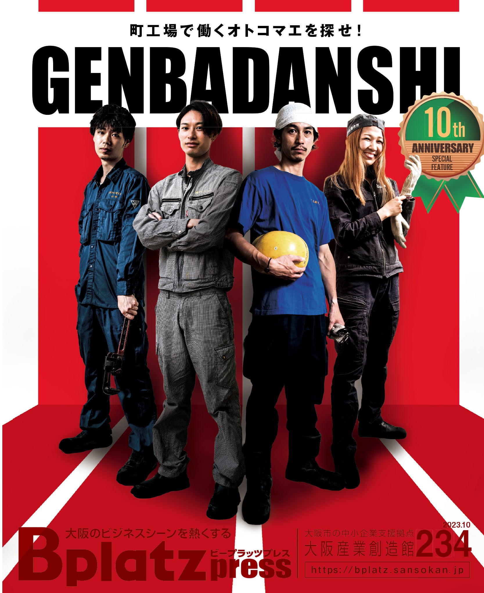 大阪市の中小企業支援拠点「大阪産業創造館」が発行するビジネス情報マガジン「Bplatz press(ビープラッツプレス)」では、中小製造業など技術の現場で働く若手人材の活躍を発信する採用応援プロジェクト「ゲンバ男子」を2013年10月にスタートさせました。この10月に10周年を迎えるにあたり、2023年10月10日発行「Bplatz press(ビープラッツプレス)」にて「ゲンバ男子10周年」を特集します。
