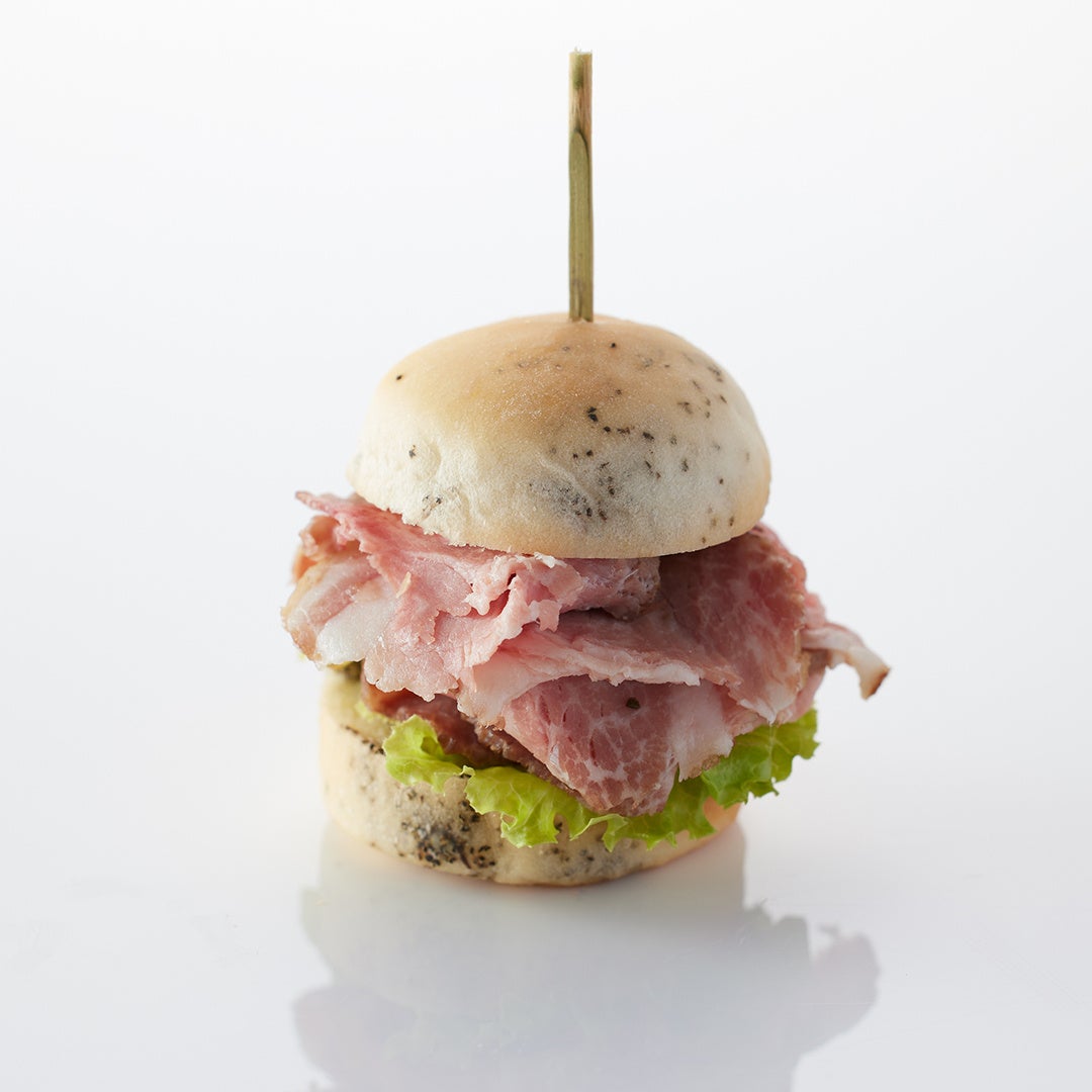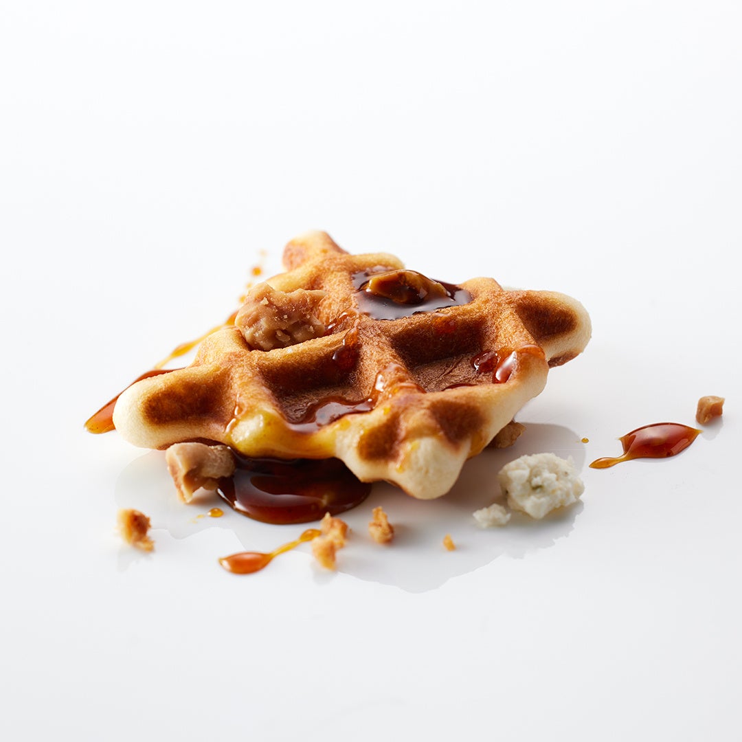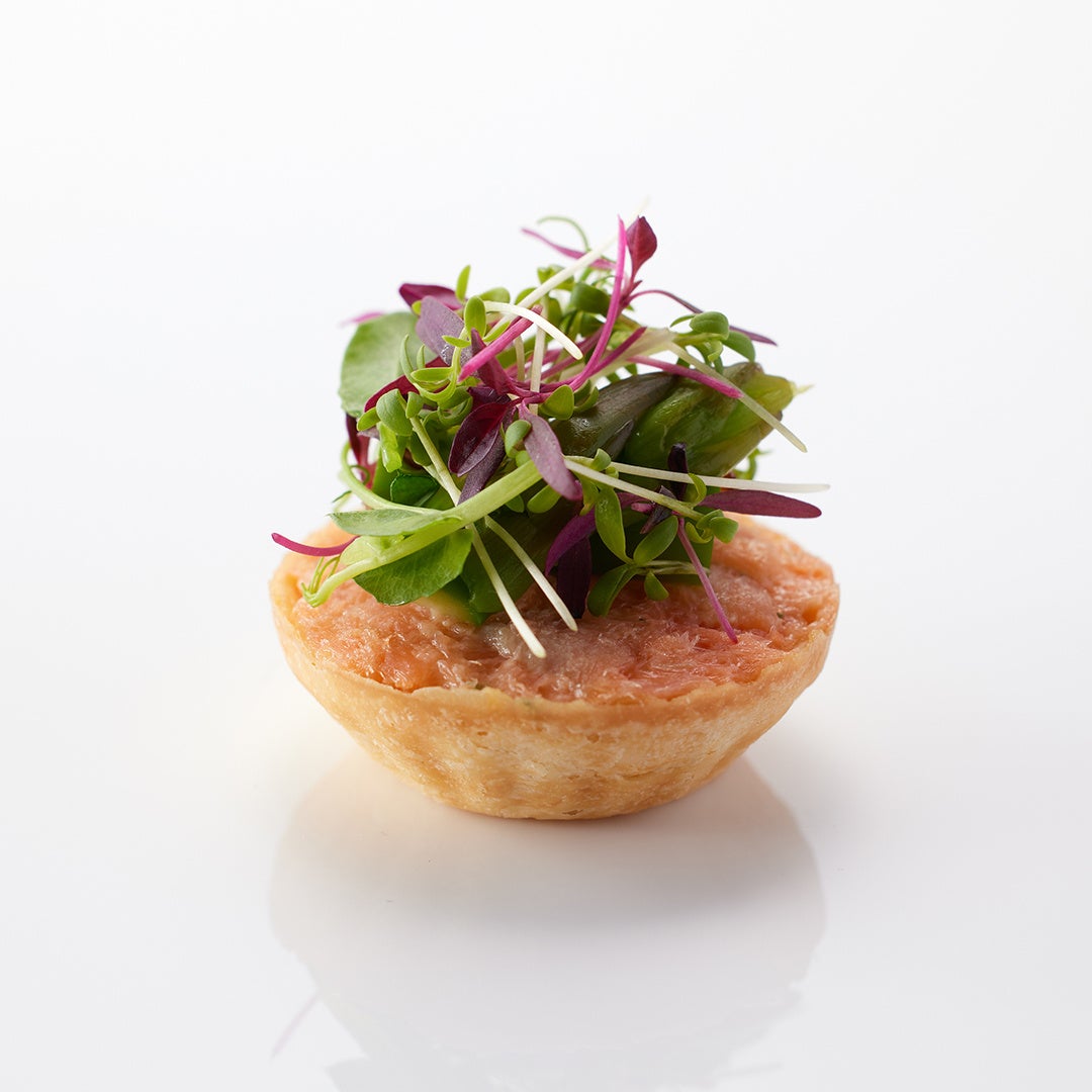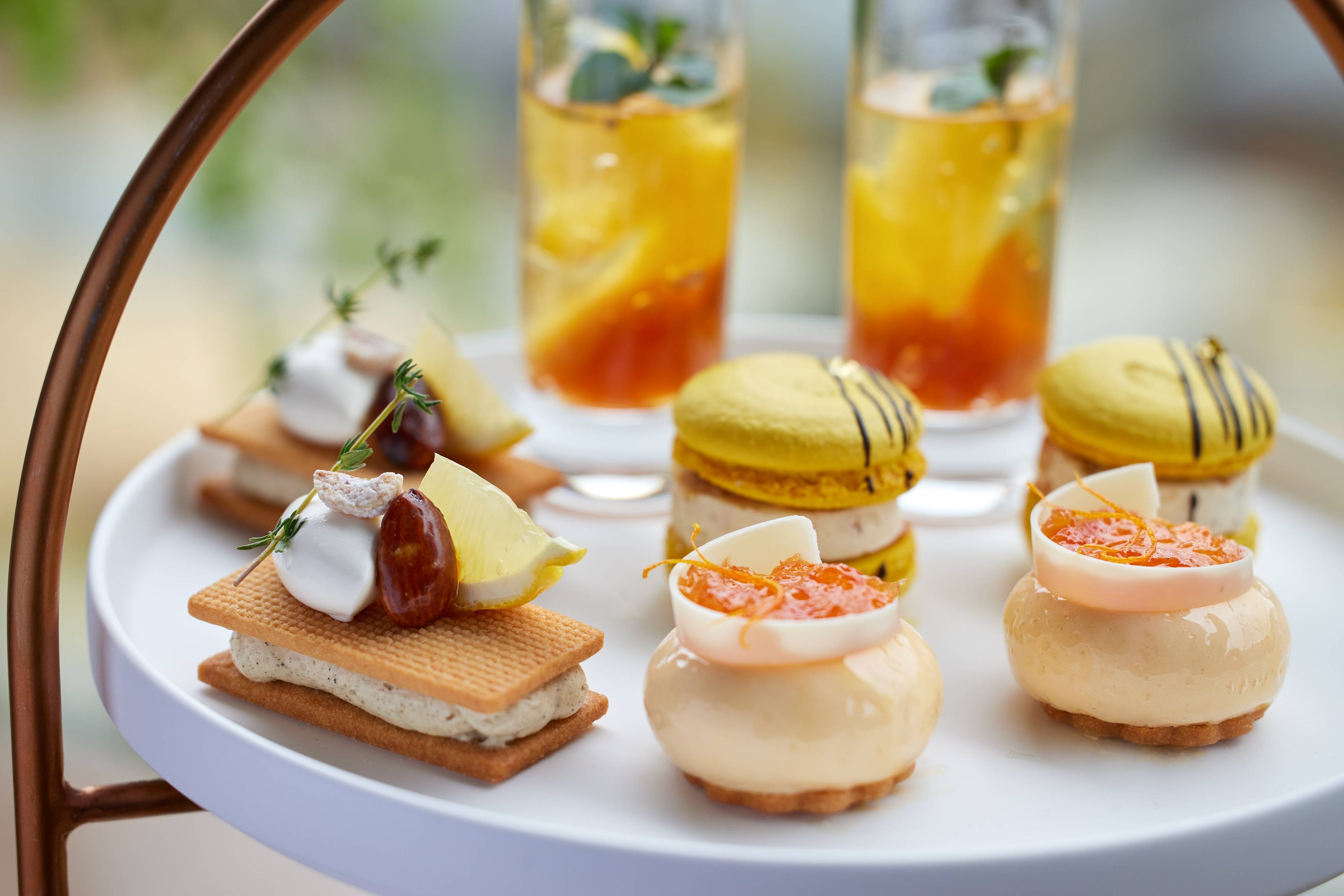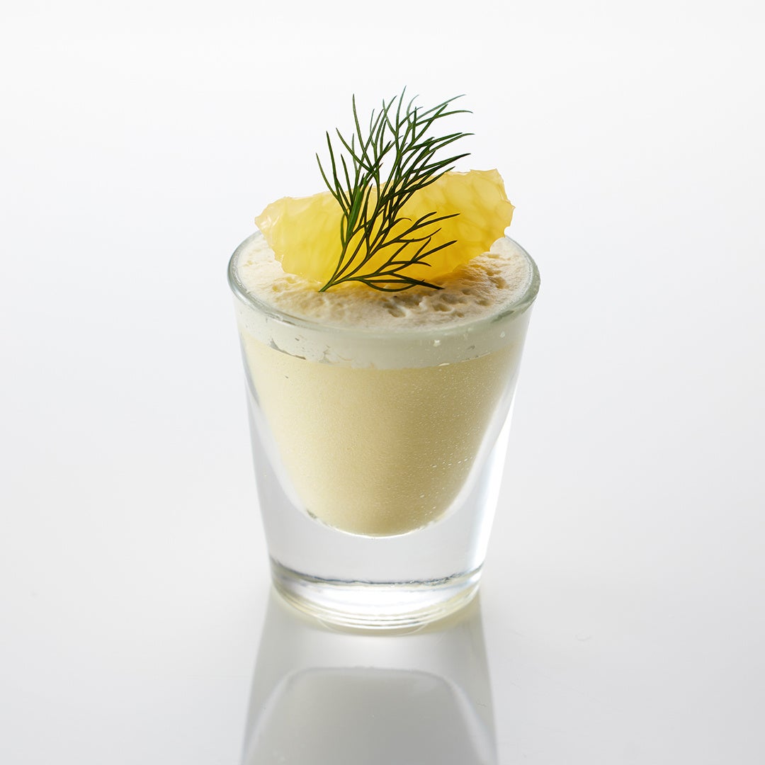 静岡県産のポークを低温調理し、オレンジティーの風味を効かせたスライダーバーガーは、食べごたえのあるジューシーな肉質とオレンジの爽やかな香りの調和をお楽しみいただけます。黄色いパプリカのムースには、香り高いペルノー酒風味のクリームをのせ、鮮やかなイエローが映えるニューサマーオレンジをトッピングしました。蜂の巣をイメージした見た目のワッフルは、焦がし蜂蜜の風味の胡桃が香ばしく、ハーブを練り込んだクリームチーズとの相性抜群です。静岡県産のサーモントラウトのリエットを、旬のアスパラガスとあわせたタルトには、富士山の裾野の新緑を思わせるマイクロハーブを飾りました。
