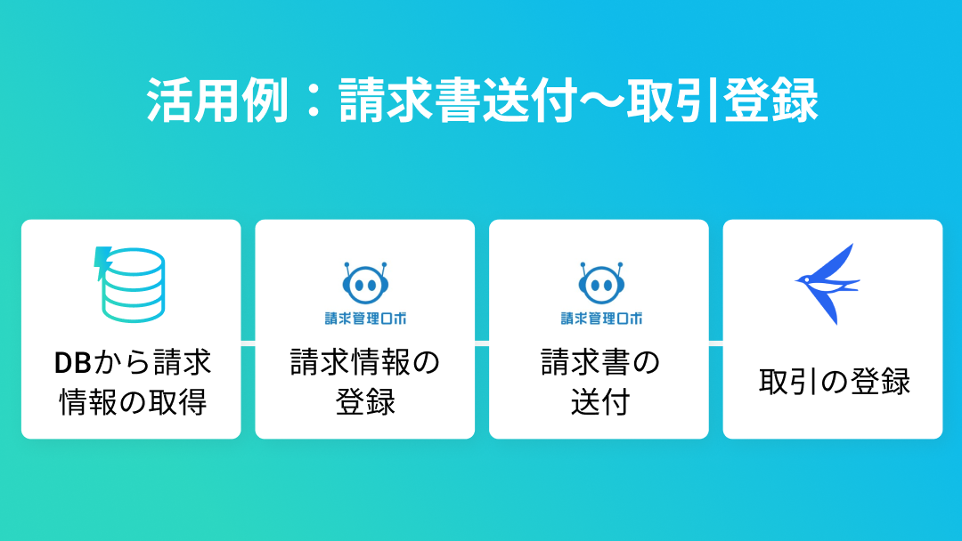 「請求管理ロボ」と「Yoom」を連携することで、請求情報の取得、請求書の送付、請求情報の会計システム連携など、請求管理ロボを用いた日々の業務をノーコードで自動化することが可能です。