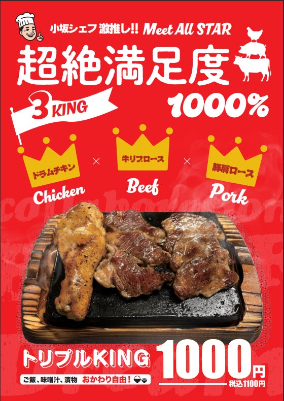 1000円で肉のトリプルキングを10月より販売開始!牛・豚・鶏の食肉の中で最も味の良い部分を選りすぐった新商品。