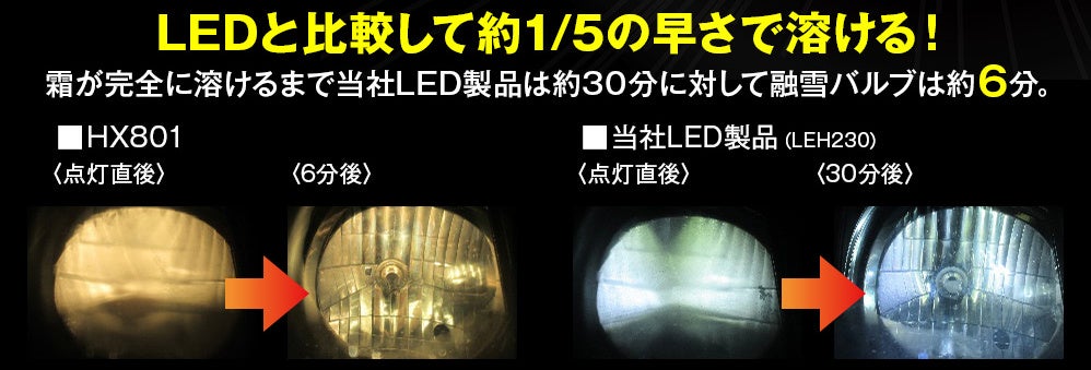 霜が完全に溶けるまで当社製品は約30分に対して融雪ハロゲンバルブは約6分!