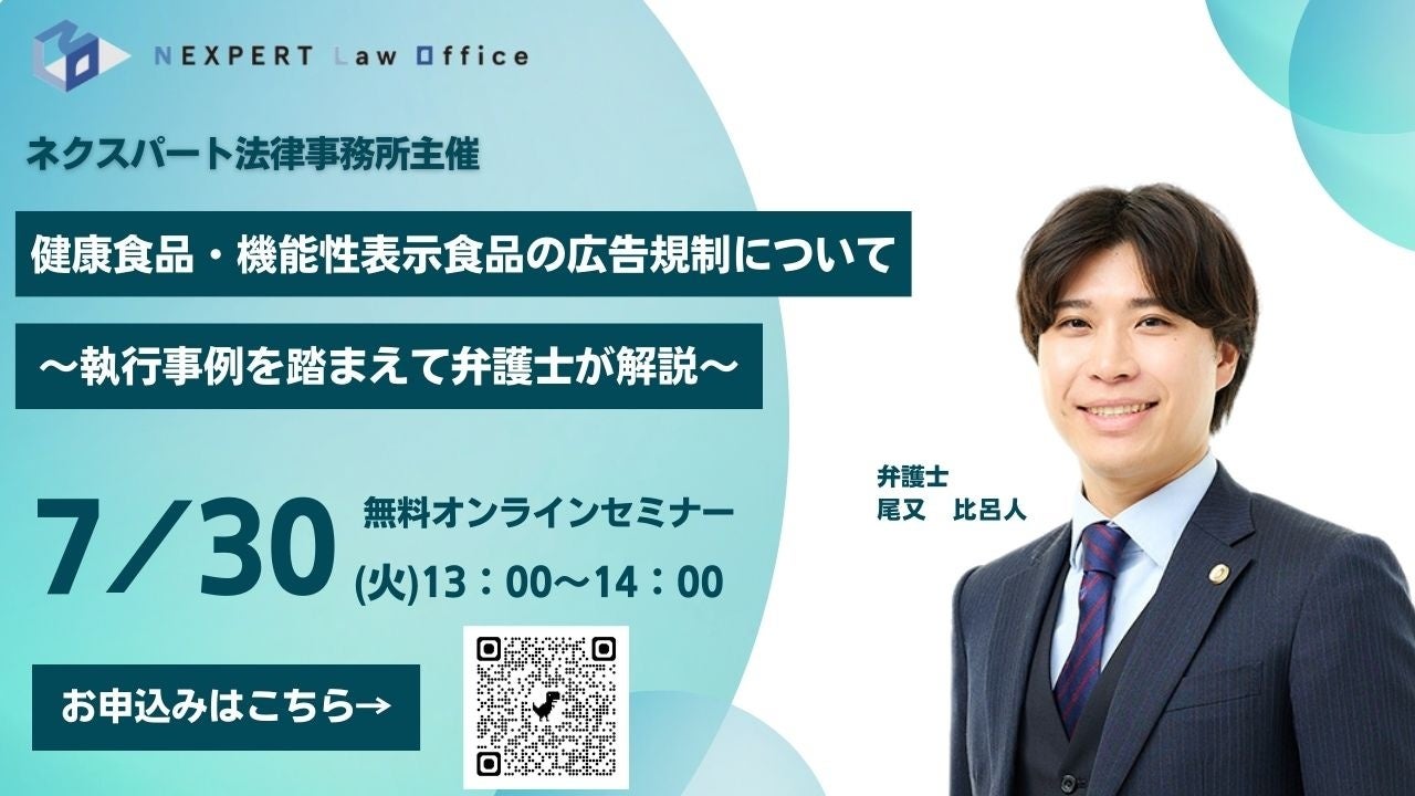 弁護士法人ネクスパート法律事務所(東京都中央区京橋、代表弁護士:佐藤塁 寺垣俊介 https://nexpert-law.com/ ) は、2024年7月30日13時から「健康食品・機能性表示食品の広告規制について~執行事例を踏まえて弁護士が解説!~」を開催します。