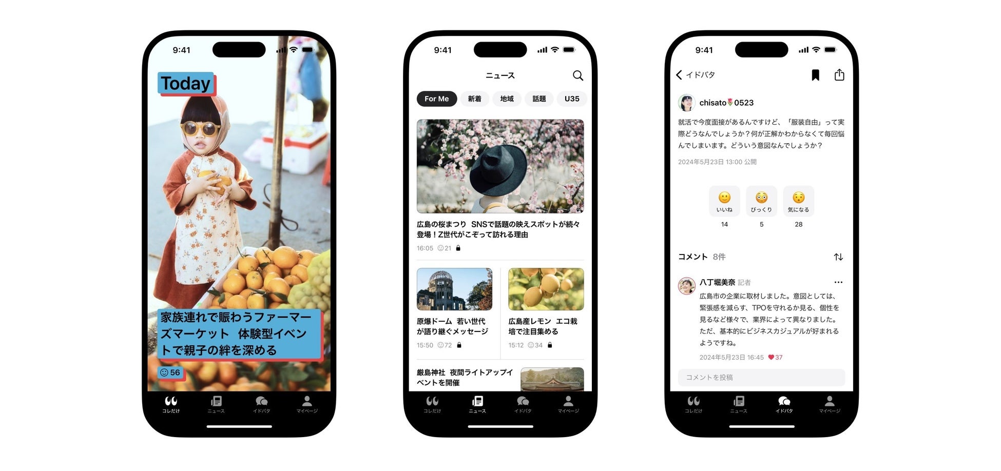 「みつける、みになる、みんなでつくる」をコンセプトに、2024年3月にリリース。ニュースと出合い、学び、自ら関わるまったく新しいニュース体験を目指すアプリです。大きな特長は、SNSのような画面デザインでニュースの概要を伝える「コレだけ」と、記者とユーザーが直接対話できる投稿機能「イドバタ」です。
