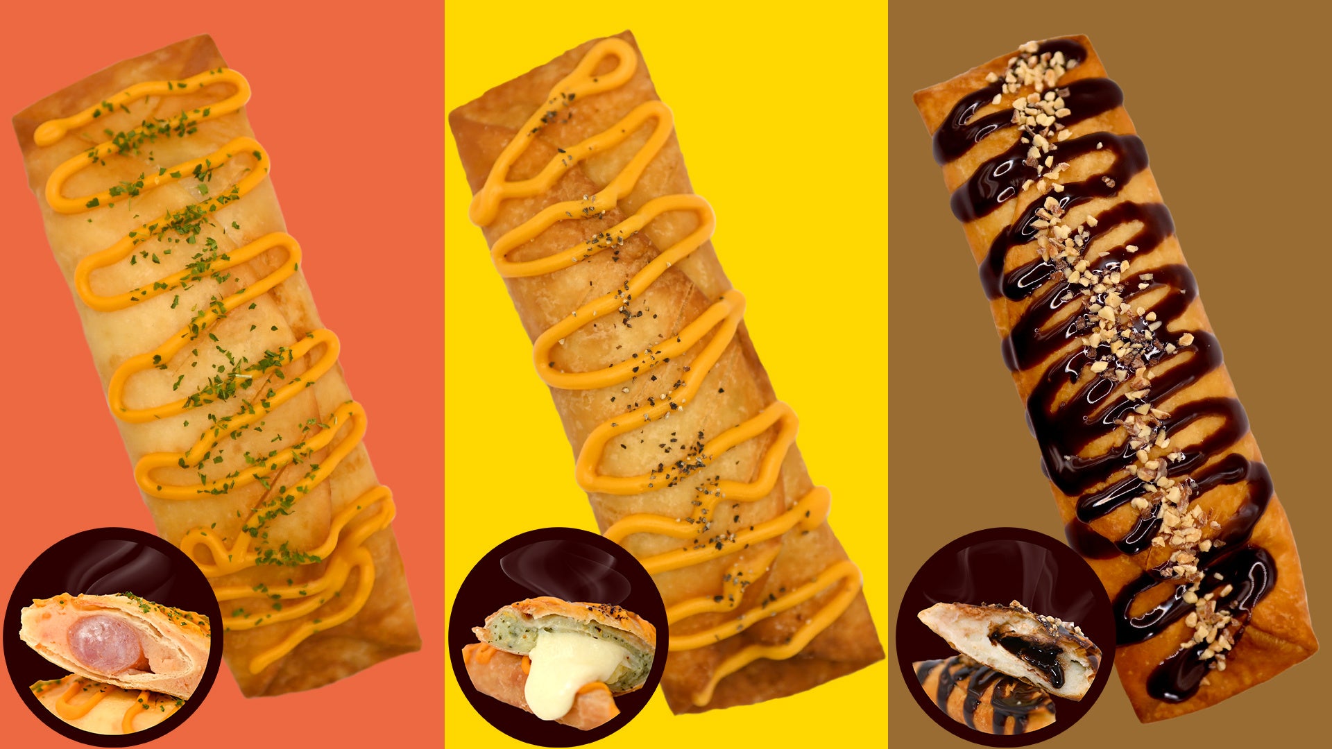 今回はテイクアウトグルメとして、食事としてもデザートとしてもお楽しみいただけるよう「ソーセージ」「チーズ」「チョコ」の3種類を展開いたします。