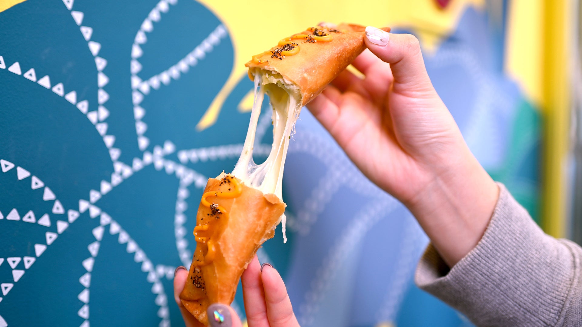 ジェノベーゼのマッシュポテトにチーズを入れたあげティーヤ。最後にかけるブラックペッパーがアクセントになっています。チーズがビヨーンッ!と伸びるので写真映えすること間違いなし!出来立てはアツアツなので注意しながらお召し上がりください。