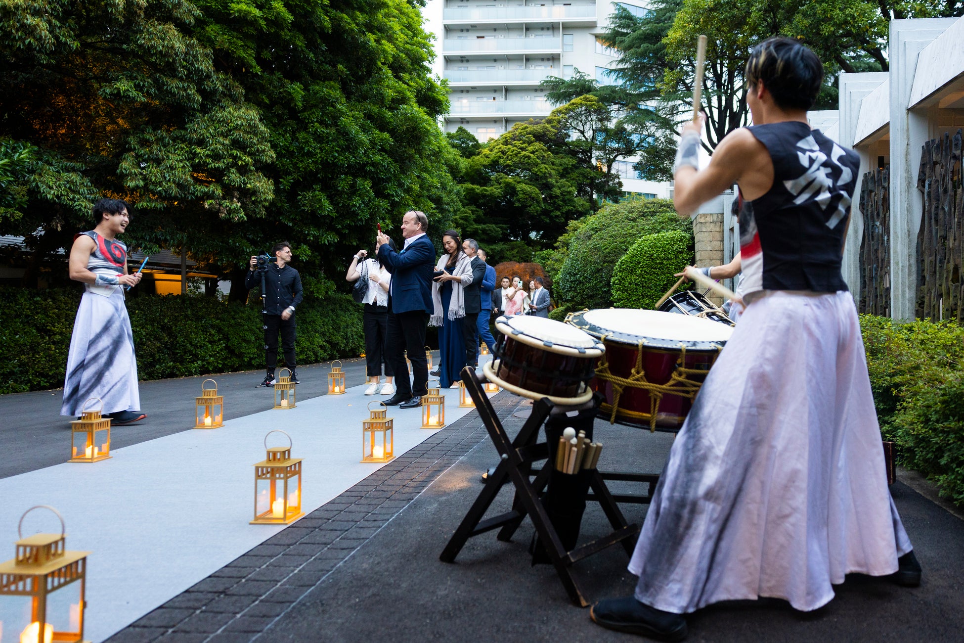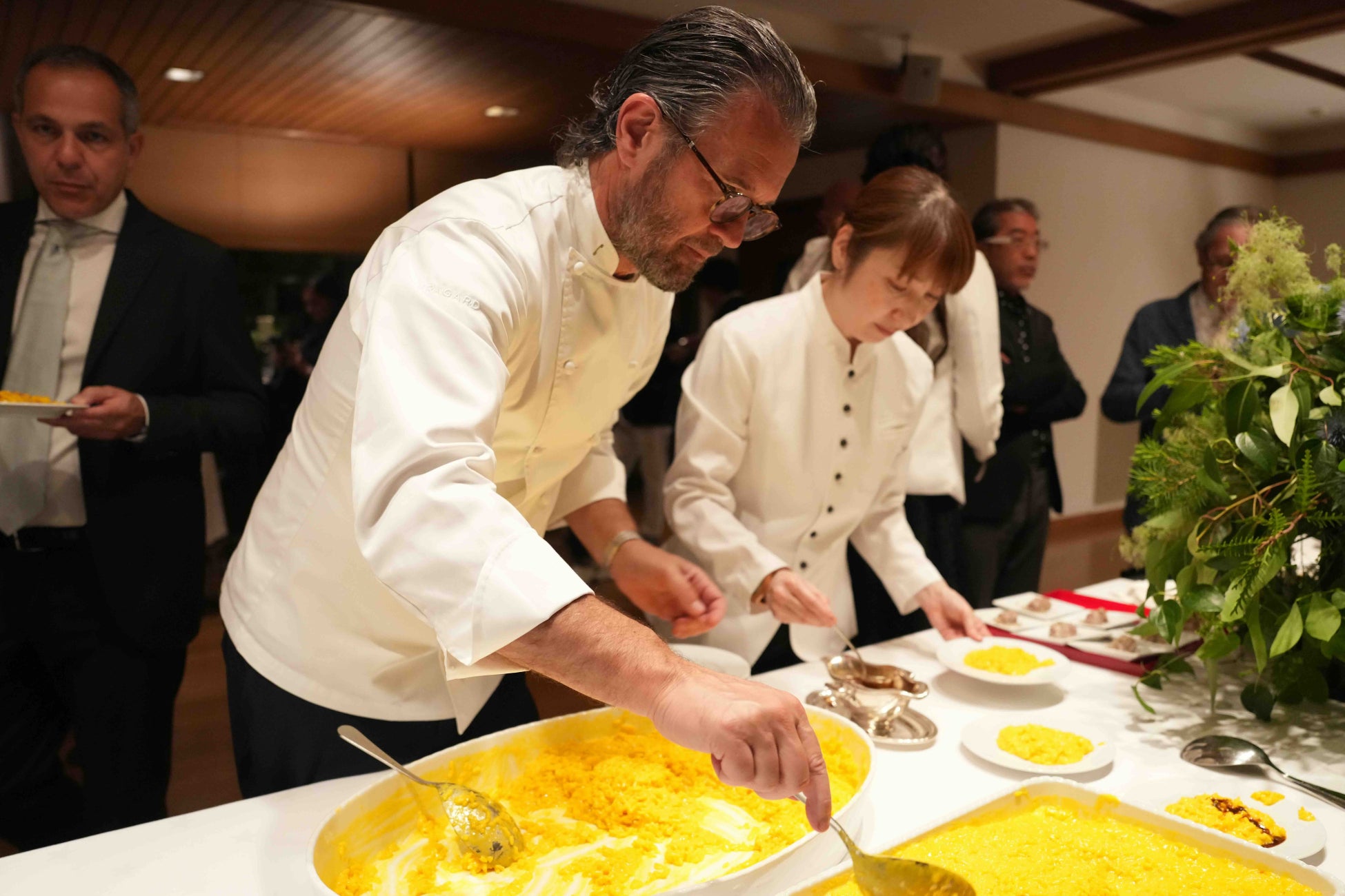 1日目の夜はイタリア大使館にてレセプションを開催。和太鼓の演奏による華やかな歓迎に続き、イタリア大使 ジャンルイジ・ベネデッティ氏が登壇し、温かいウェルカムスピーチで来場者を迎えました。また、イタリアを代表するスパークリングワインブランドFerrariやミラノを拠点に活躍するミシュランシェフ、カルロ・クラッコ氏による洗練された立食形式のビュッフェが振る舞われ、来場者はイタリアンガストロノミーの真髄を堪能していました。そして圧巻のアリアが披露されると、会場は歓声と拍手に包まれ、レセプションの華やかな締めくくりとなりました。