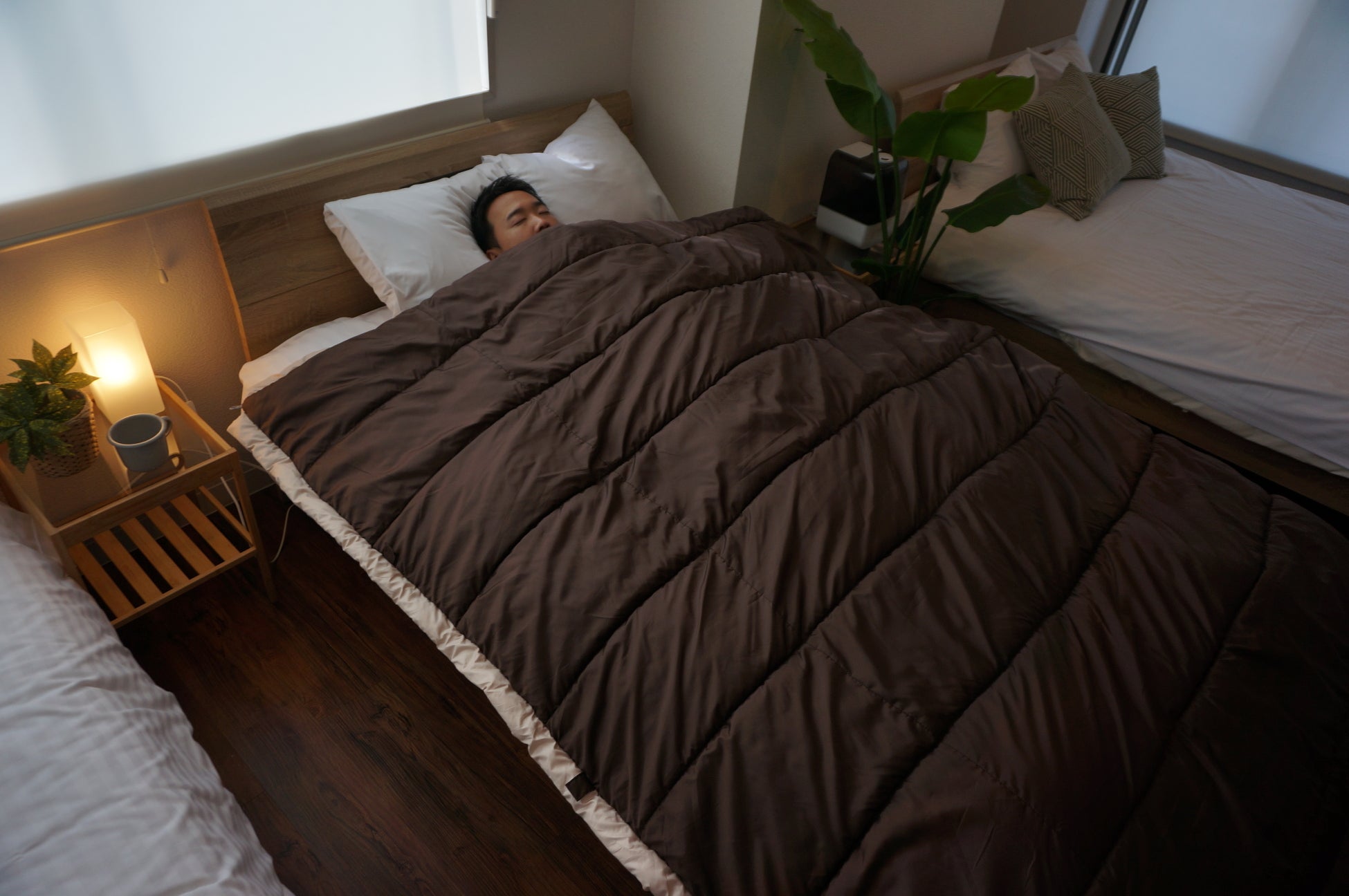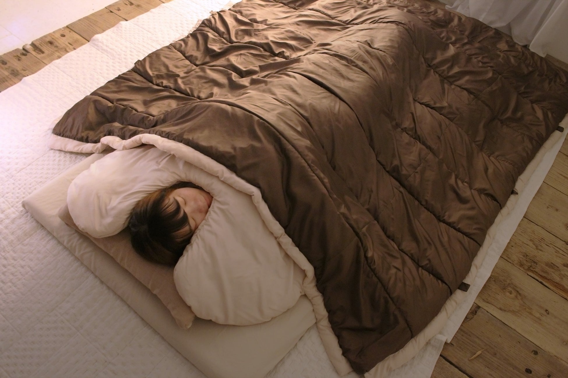 普段お使いの布団の上に掛けて使えば保温力がアップします。寝袋由来の軽くて暖かさをため込む中綿を使用しているので、広く優しく包み込まれるような感覚で心地よく眠れます。