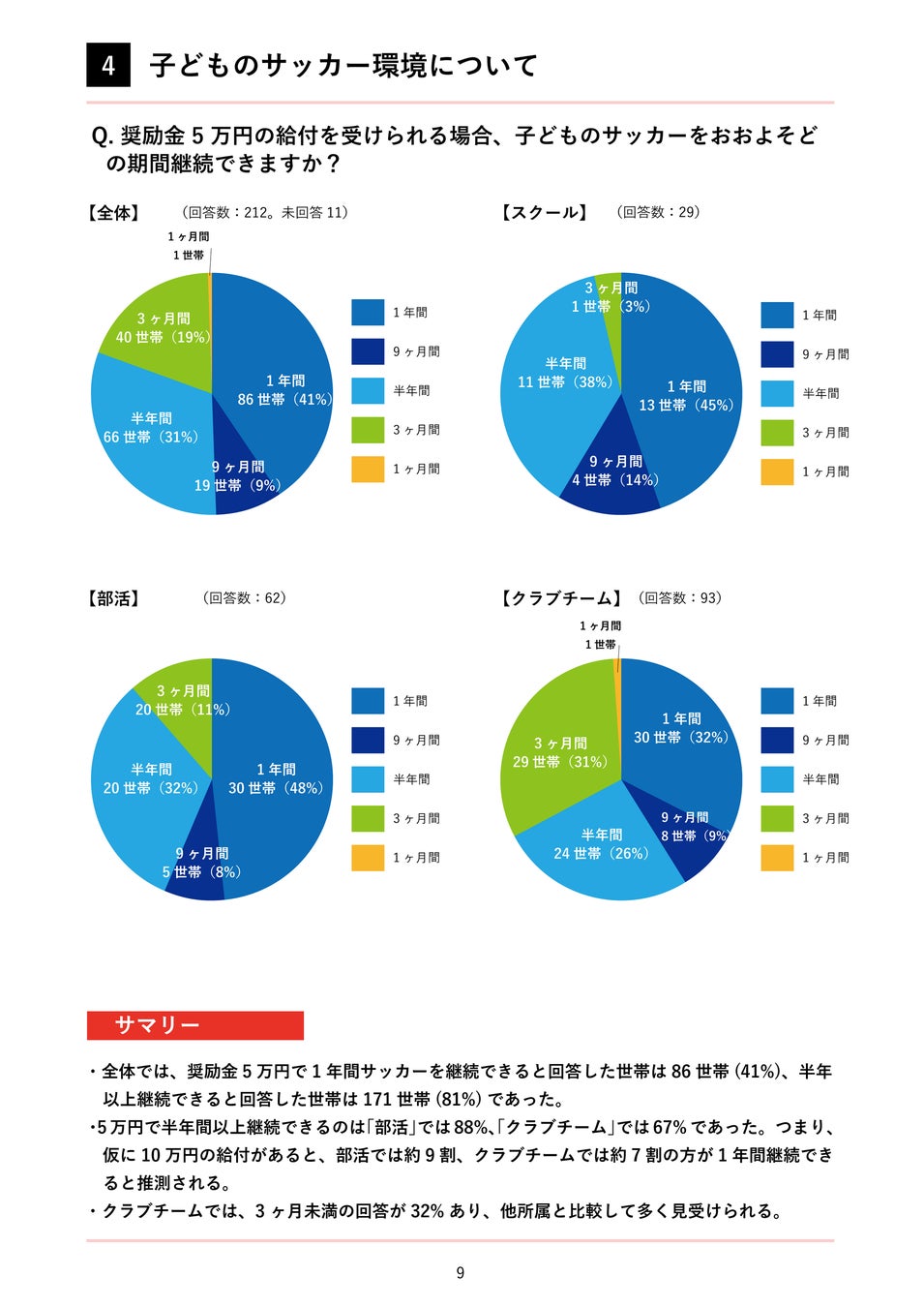 奨励金が5万円ある場合、「部活」では88%、「クラブチーム」では67%がサッカーを半年間以上継続できると回答。