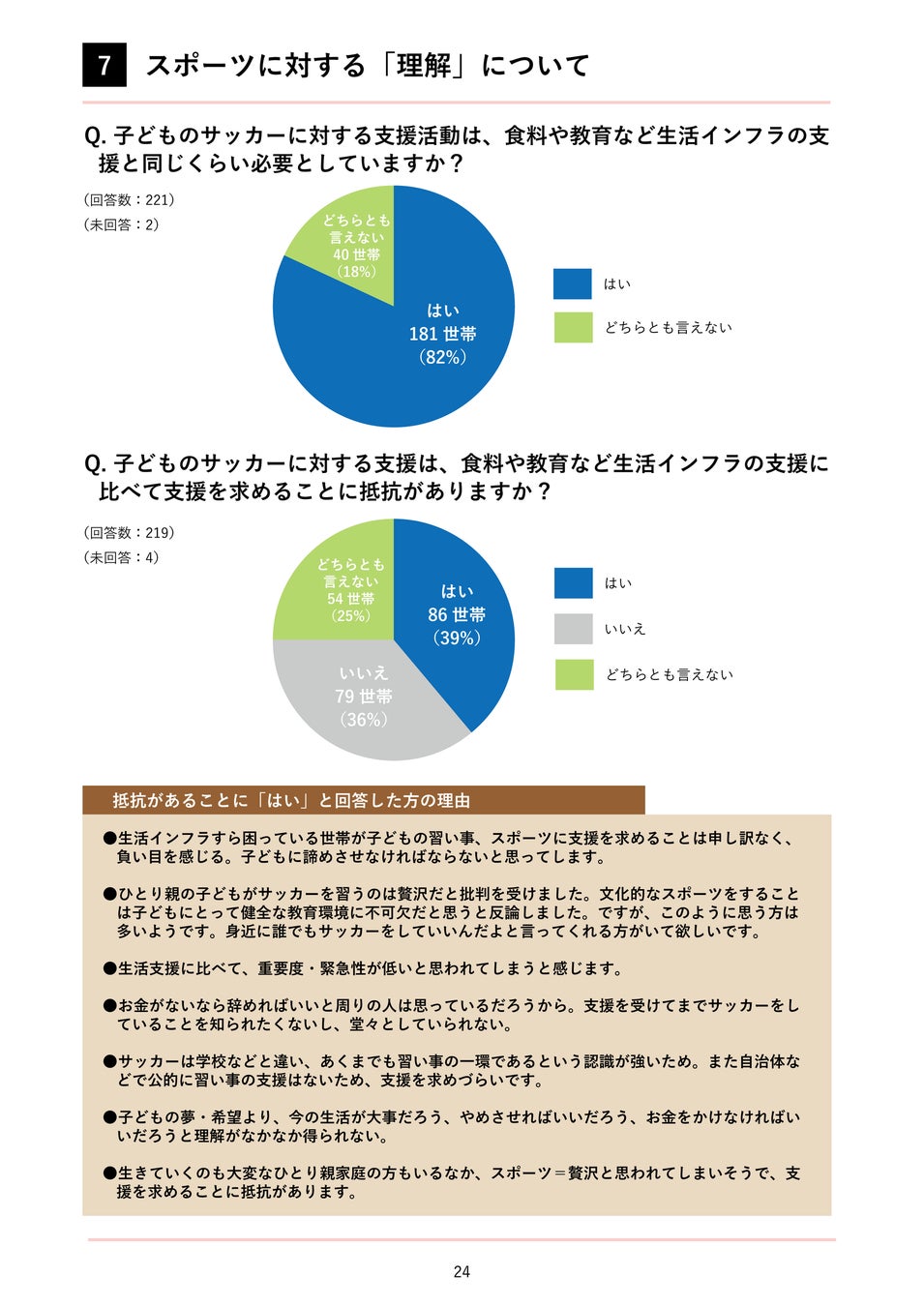 その理由として、「ひとり親の子どもがサッカーを習うのは贅沢だと批判を受けました。このように思う方は多いようです」、「子どもの夢・希望より、今の生活が大事だろう、やめさせればいいだろうと理解がなかなか得られない。」「贅沢だと捉えられてしまう風潮があるので支援を求めるのに躊躇した」、「世間ではシングル家庭ならそれ相応の身の丈に合った暮らしをすれば良い、習い事をさせなければ良いという考え方の人が多そうで抵抗があります」スポーツが世間から娯楽や趣味として捉えられやすいことに対する声が挙がっている。