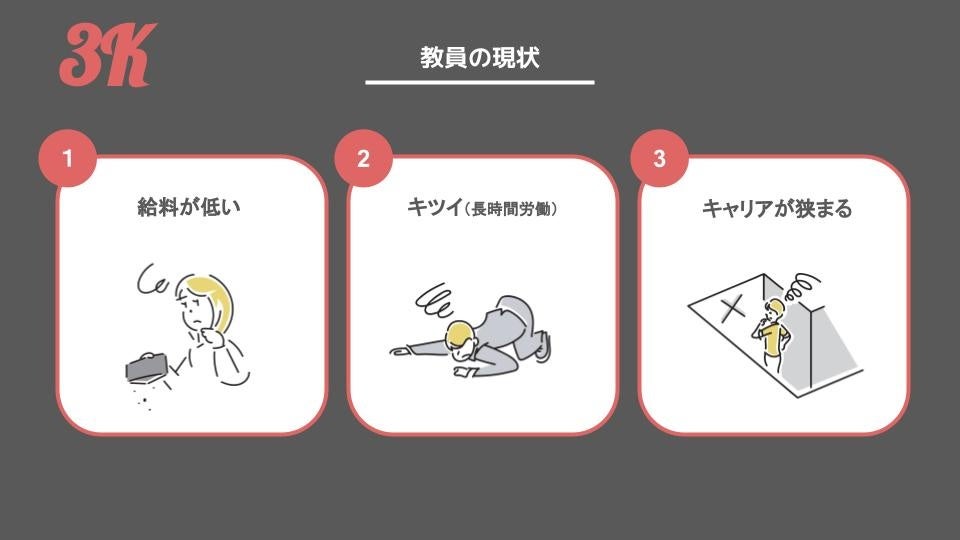 これらも、「給料が低い」「キツイ」「キャリアが狭まる」の3Kによる影響であるため、当校では独自の仕組みで教員不足の解消を目指しています。