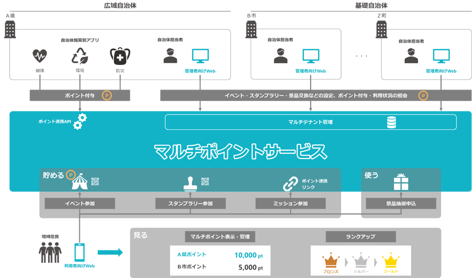 「マルチポイントサービス」は、県や市町村など複数の自治体ポイントを単一基盤で統合することを可能にした、Webアプリ方式のマルチテナント型ポイント基盤サービスです。