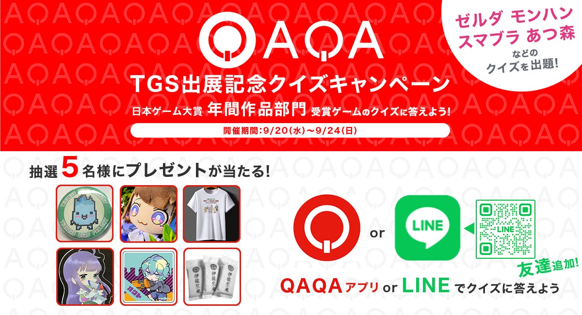 クイズキャンペーン期間中に、『QAQA』公式アプリ、もしくは、『QAQA』公式LINEアカウントから出題されるクイズに解答した方の中から抽選で5名様に協賛企業のグッズ詰め合わせが当たる「TGS出展記念 クイズキャンペーン」を開催いたします。