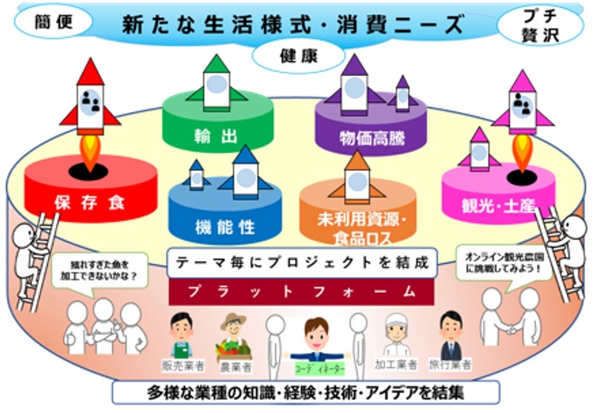 宮崎県の強みである農林水産業の高付加価値化に向けた取組を推進するため、食と農に関する多様な関係者が参画し、各々の知見・経験・技術等を結集する“みやざきLFPプラットフォーム”を設置しました。特徴は、食品関連に限らず幅広い業種の事業者が参画していることで、令和6年11月30日時点で277 事業者(農林漁業者、加工・販売業者、観光業者、大学、地域商社など)が入会しています。県内の数多くの事業者が共通の課題を持つことでより効率的にプロジェクトに参加できるよう、 “有機”、“未利用資源・食品ロス”、“保存食”、“香り”、“輸出”、“観光・土産”、 “物価高騰”などテーマで分科会を作り、それぞれ関心があるテーマ毎に事業者が集まり、ワークショップを通じて新たなビジネス創出に向けた意見交換を行いながら、プロジェクトチームを結成していきます。下図のように分科会の各テーマはロケットの発射台に例えられ、各チームで地域課題の解決と経済性の両立に向けて、プロジェクト(ロケット)に取り組み、ビジネスの創出(発射)を目指しています。今後は、各プロジェクトから生み出された新商品やサービスが事業者の所得向上や雇用の創出、交流人口の増加など価値連鎖を生むことで、地域経済の活性化を目指しています。