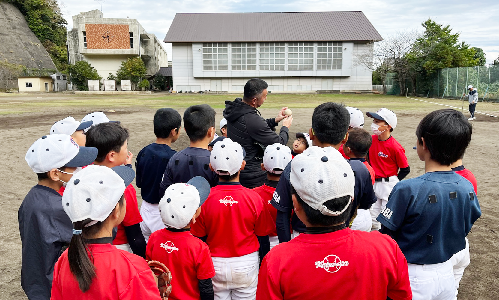 ビーチクリーン活動後は、元プロ野球選手であった岡本氏が直々に講師となり、野球教室を開催しました。