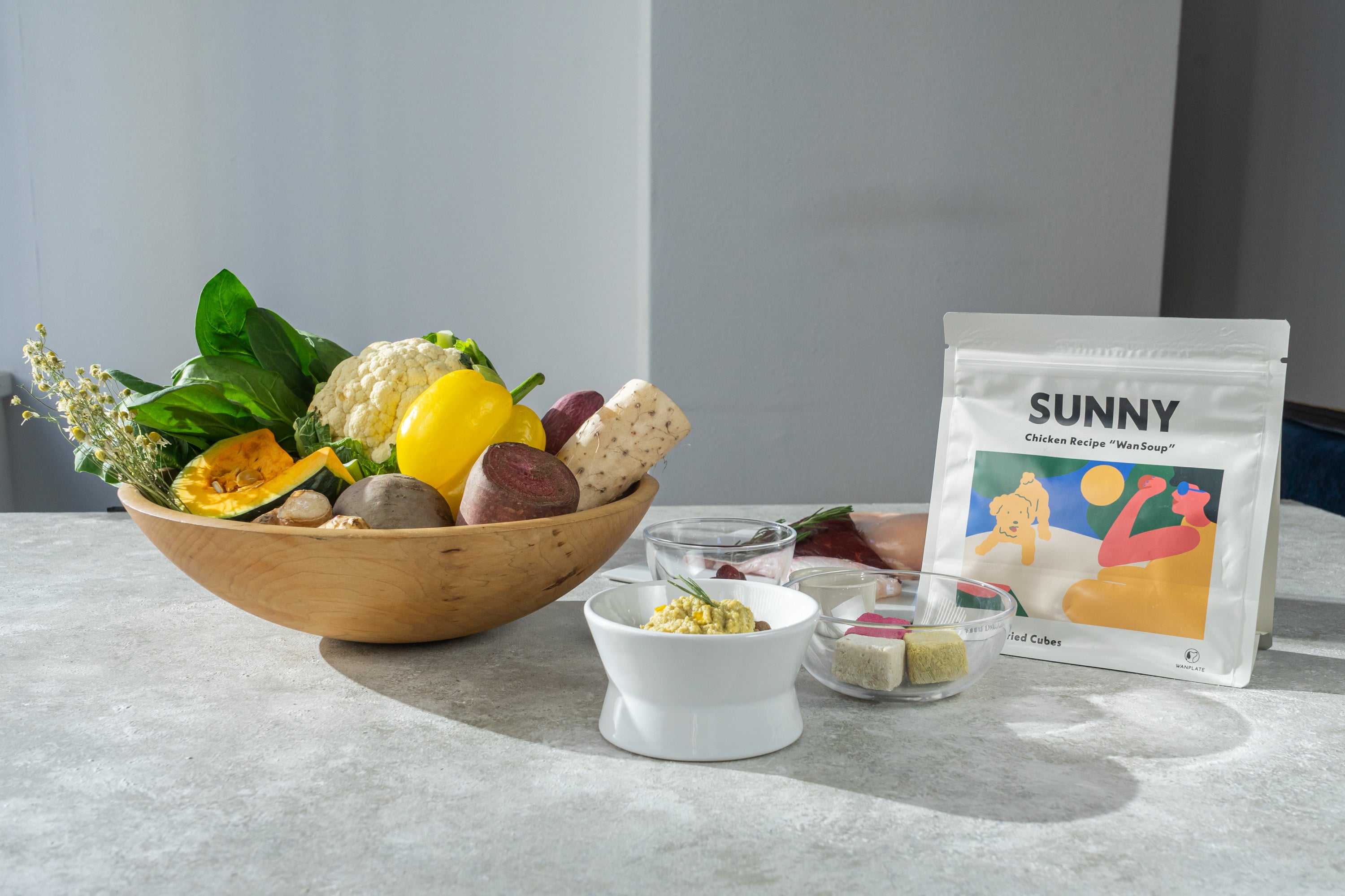 食材の色をしっかりと活かし、パートナーにも飼い主さまにも、一緒にWanSoup時間を楽しんでいただけるよう、カラフルな見た目、キューブの形にもこだわりました。