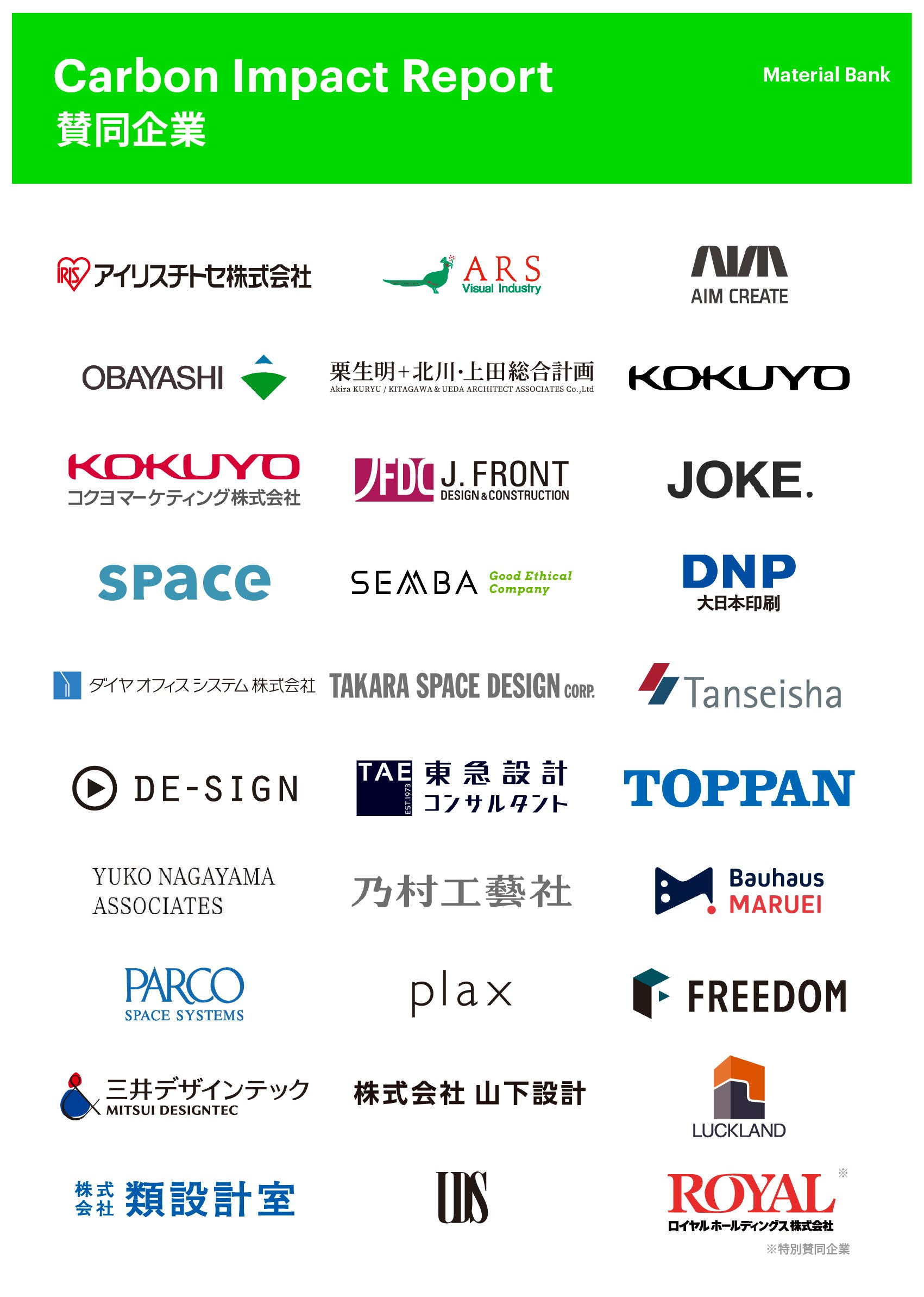 Carbon Impact Programには、業界を代表するデザインファーム30社(添付資料参照)が賛同しており、本年度は合計で年間64.8トンの二酸化炭素(CO2)排出削減を実現しました。レポート内には他にもMaterial Bankの利用により削減されたパッケージ数はじめとした数値実績を記載しております。