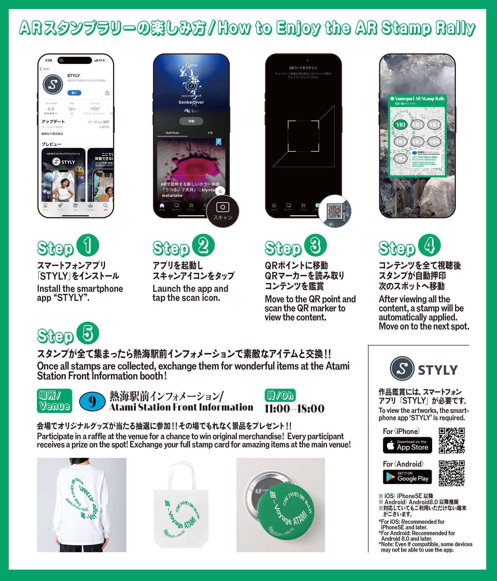 イベントの参加方法は、スマートフォンアプリ「STYLY」をインストールいただき、展示スポットに掲示しているORコードをスキャンすることで、拡張空間に出現する作品を鑑賞することができます。コンテンツを全て視聴後スタンプが自動押印されますので、7箇所全ての会場を巡ってスタンプ集めてください。全ての作品を鑑賞、スタンプをコンプリートした方全員に、ATAMI ART GRANT 2023オリジナルグッズを抽選でお渡しいたします。