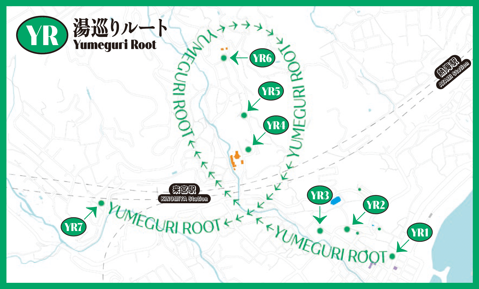 [1]熱海七湯 河原湯 → [2]熱海七湯 小沢の湯 → [3]熱海七湯 大湯間欠泉 → [4]来宮源泉タンク → [5]市営温泉西山動力室 → [6]gekiyaku横のお風呂 → [7]梅園町丸高土地