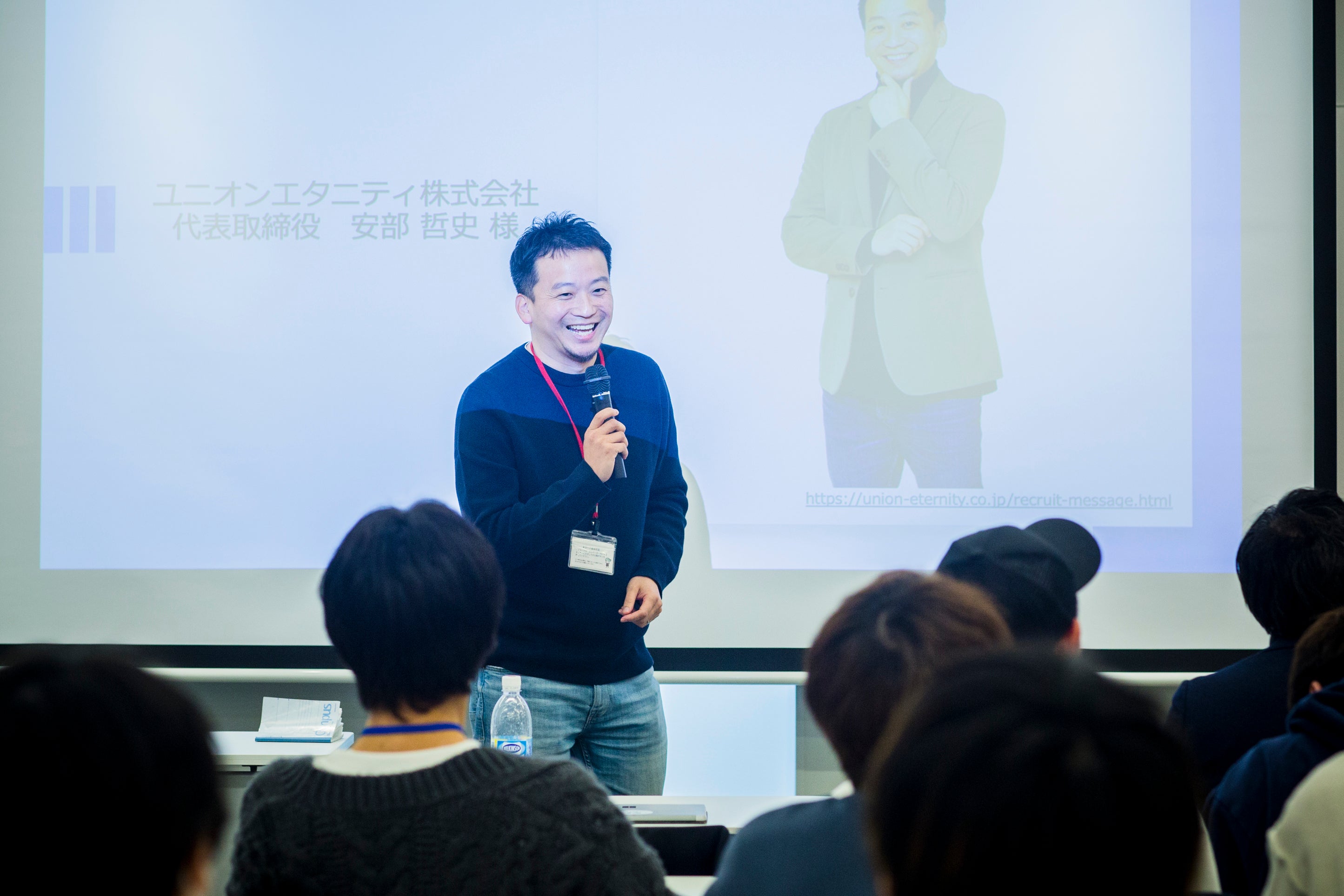 今回のプロジェクトはEOメンバーであり、廃車買取サービス「ハイシャル(https://haishall.jp/)」や、中古車フリマサイト「クリマ(https://kuruma-furima.jp/)」、車陸送サービス「車陸送.com(https://car-rikusou.com/)」、総合自動車サービス「mobiful(https://mobiful.jp/)」など自動車に関わる様々なサービスを展開するユニオンエタニティ株式会社(大阪府大阪市、以下「ユニオンエタニティ」)の代表取締役 安部哲史氏(写真)、取締役 角田裕典氏が講師として参加。日頃、大学で人を幸せにするビジネスデザインを学んでいる新2年生・新3年生のZ世代の学生たち29名が実際のビジネスを肌で感じながら、人とのつながりを大切に成長し続けていくことを企業理念とするユニオンエタニティの新しいカーアイテムを創造するプロジェクトで、2月28日のキックオフから3週間、全6回の授業を通して取り組みました。