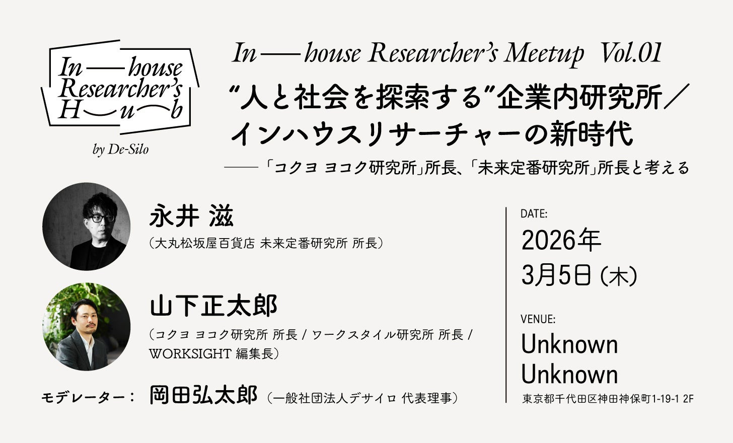 3月5日(木)には活動第一弾として、コミュニティイベント「In-House Researcher's Meetup Vol.1」を開催。「“人と社会を探索する”企業内研究所/インハウスリサーチャーの新時代──『コクヨ ヨコク研究所』所長、『未来定番研究所』所長と考える」と題し、永井滋さん(株式会社大丸松坂屋百貨店 未来定番研究所 所長)と山下正太郎さん(コクヨ ヨコク研究所 所長/ワークスタイル研究所 所長/WORKSIGHT 編集長)をゲストにお迎えします。