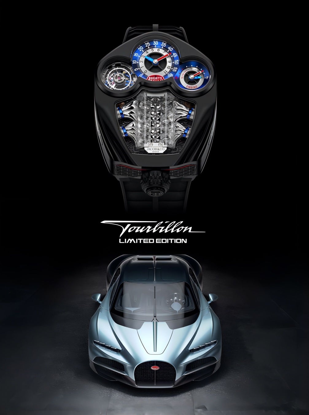 そうした成功にも後押しされ、ジェイコブ&コーとブガッティの間で“設計や理念、デザインを共有した同名のラグジュアリーウォッチとハイパーカーを製造する”という前例のないプロジェクトが秘密裏に進行していた。2024年6月、ついにこの壮大な計画が結実、ジェイコブ&コーからはラグジュアリーウォッチ「ブガッティ トゥールビヨン」、ブガッティからはハイパーカー「ブガッティ トゥールビヨン」が発表された。この発表は時計業界と自動車業界に衝撃を与え、非常に大きな注目を集めた。