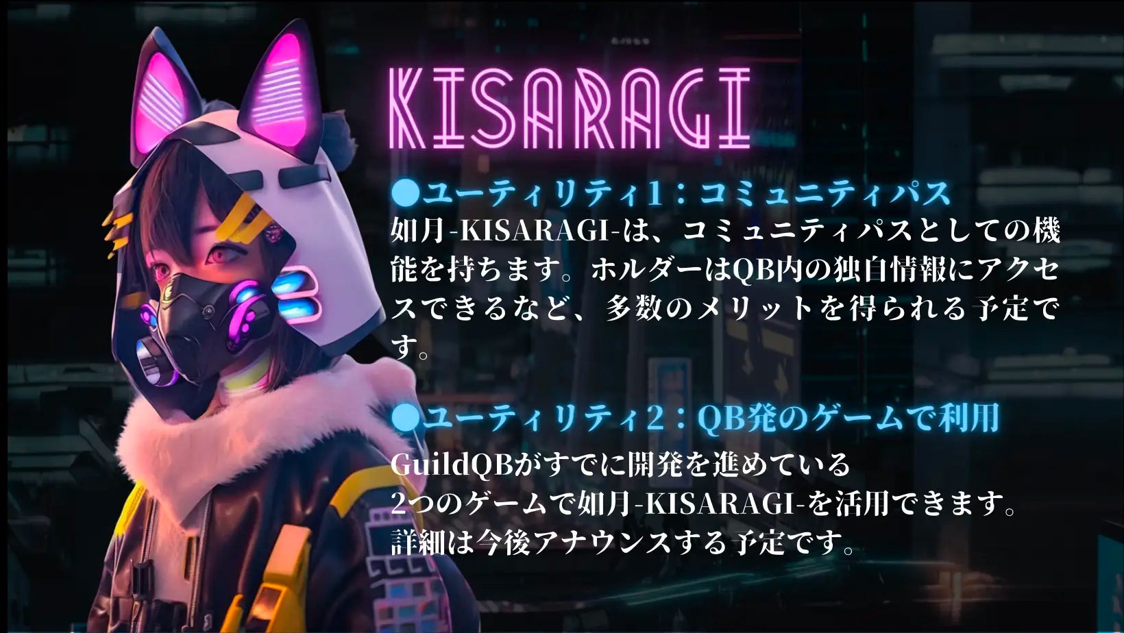 GuildQBが発売するジェネシスNFTである如月-KISARAGI-は、コミュニティパスとしての機能を持ちます。