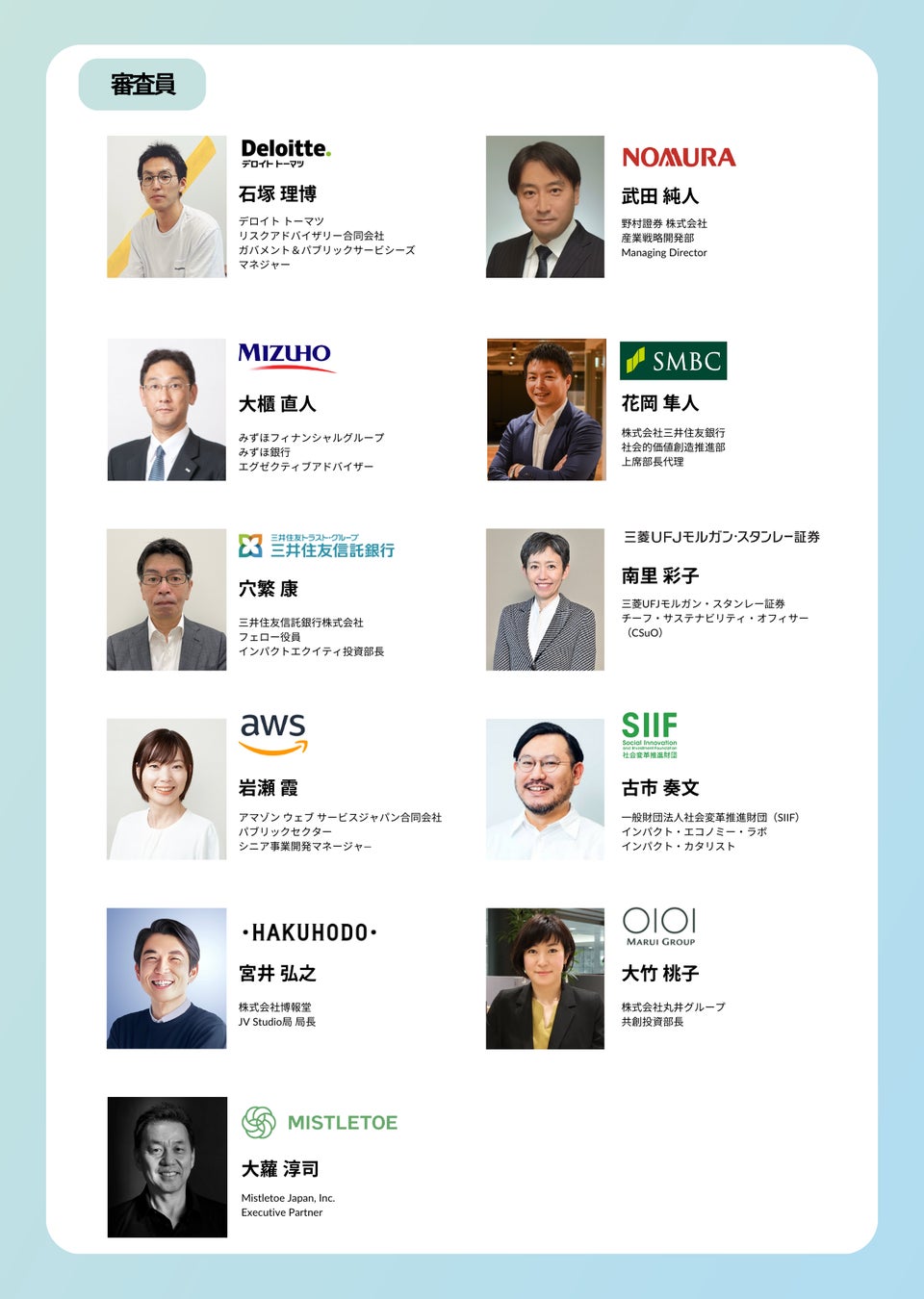 登壇企業は、創業5年未満のアーリーフェーズ(シリーズA)のインパクトスタートアップの正会員です。また、本ピッチにはインパクトスタートアップ協会の賛同会員企業が審査員として参加し、「インパクトスタートアップピッチ賞」「オーディエンス賞」「デロイト トーマツ リスクアドバイザリー賞」「野村賞」「みずほ賞」「三井住友フィナンシャルグループ賞」「三井住友信託銀行賞」「三菱UFJモルガン・スタンレー証券賞」の計8つの賞が贈られます。