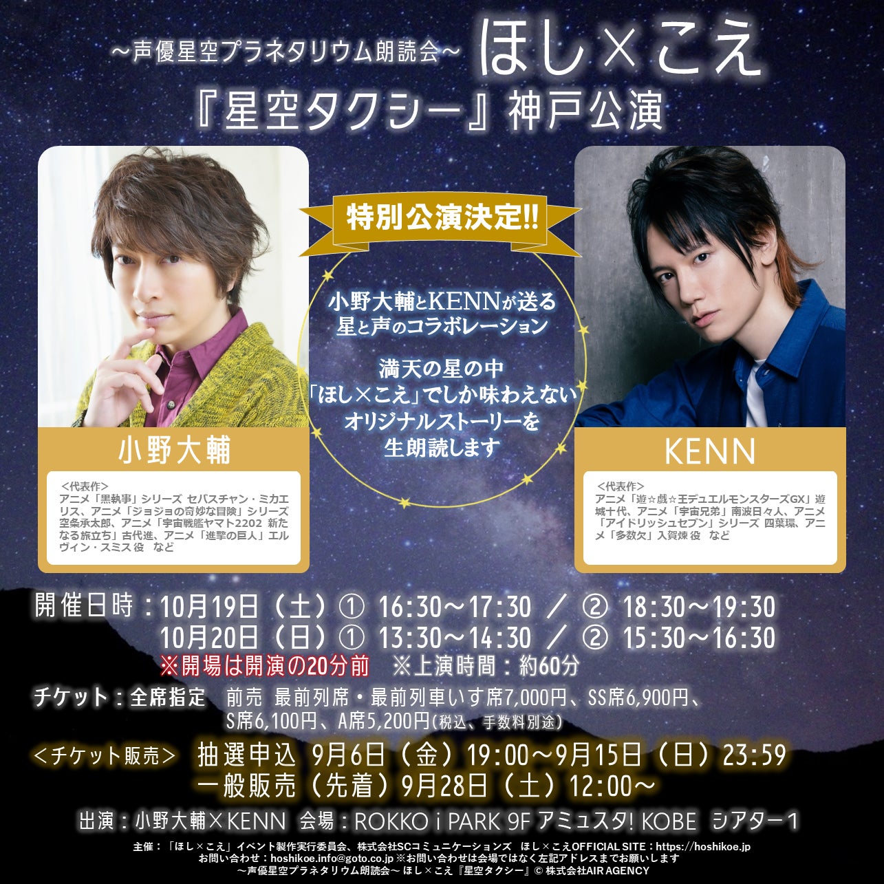 「アミュスタ!KOBE」 (所在地:兵庫県神戸市)にて、 『~声優星空プラネタリウム朗読会~ほし×こえ『星空タクシー』 【神戸公演】小野大輔×KENN』の特別公演を開催します。 今回はプラネタリウムを飛び出して、初のシアターからほし×こえの物語をお届け。チケットは9月6日(金)19:00より先行販売(抽選)開始です。