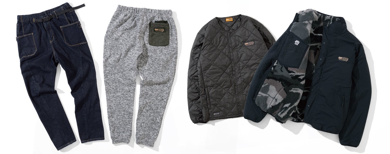 他にも、中綿入りのすっきりとしたシルエットの「パデットジャケット」、そして定番商品の「ジョグ 3D キャンプパンツ」をベースに、裏地を起毛に加工した別注モデルの4アイテムが新発売。
