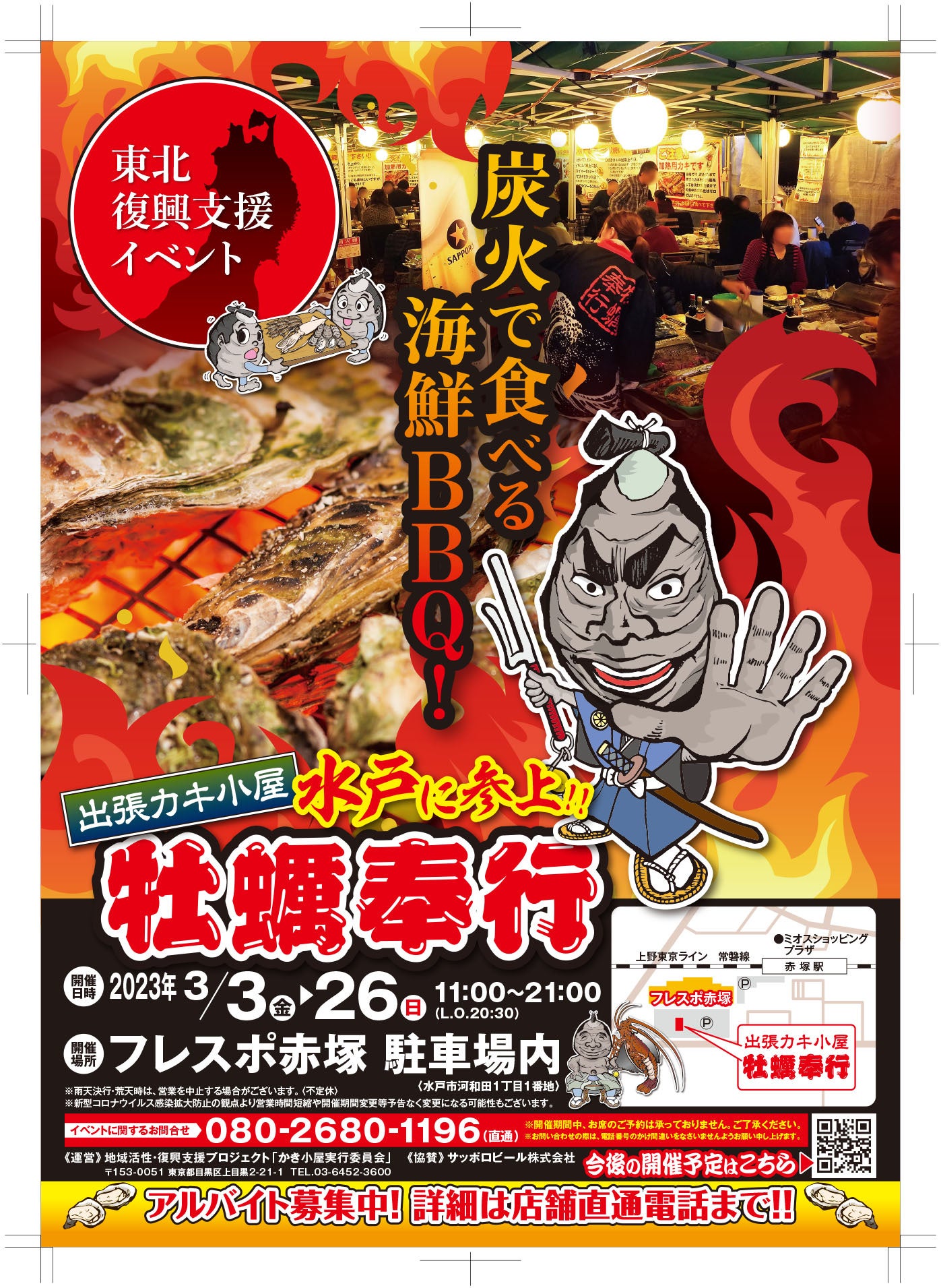 出張カキ小屋「牡蠣奉行」は東日本大震災で被災した宮城県石巻市の牡蠣を多くの人に食べてほしいと冬季限定の東北復興支援イベントとして全国各地で展開。開催期間中は毎日営業。