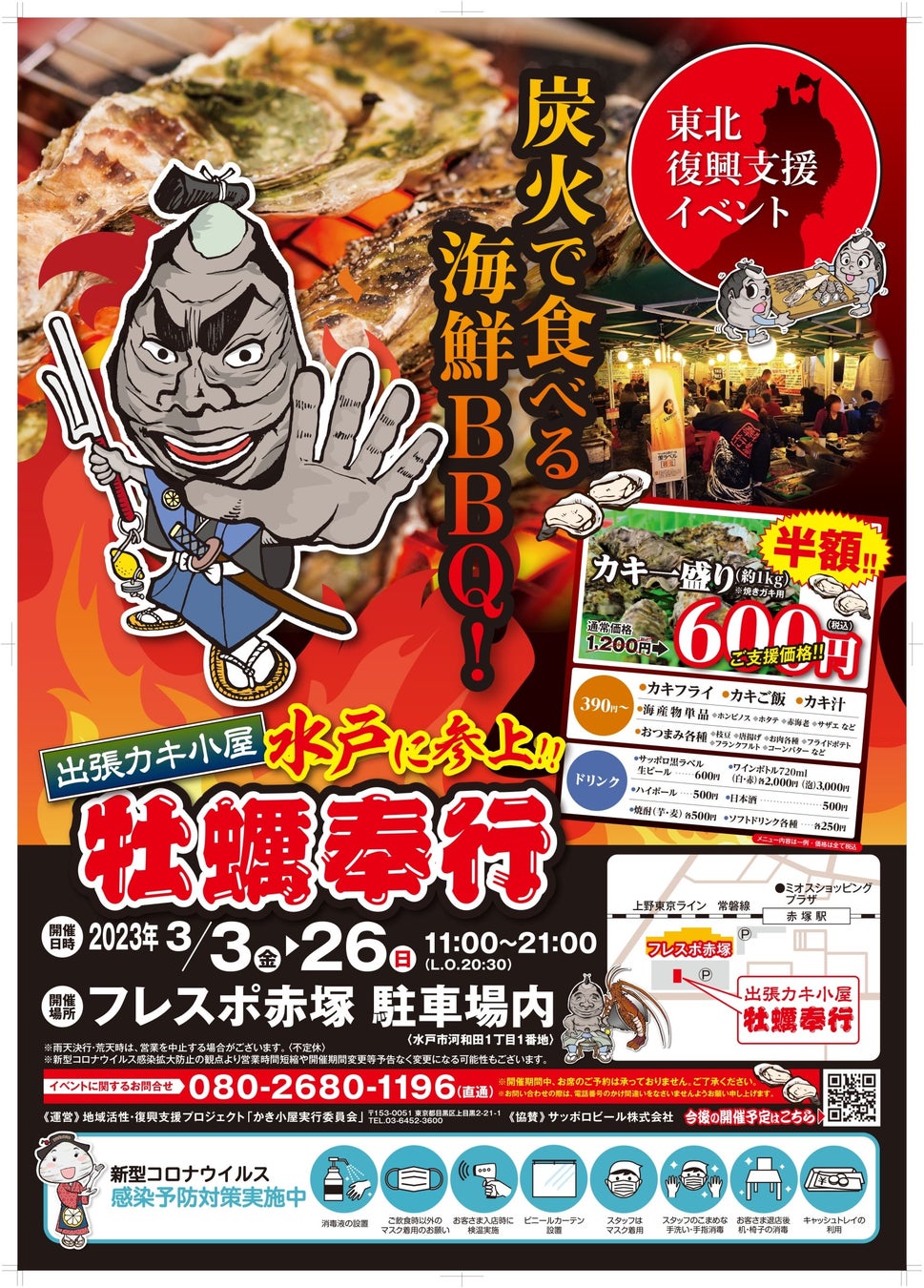 宮城県石巻の牡蠣をセルフ炭火焼き(海鮮BBQ)で楽しむ「出張カキ小屋 牡蠣(かき)奉行」(TEL 080-2680-1196)がフレスポ赤塚(茨城県水戸市河和田1丁目1)に期間限定オープン。期間は3月3日〜3月26日