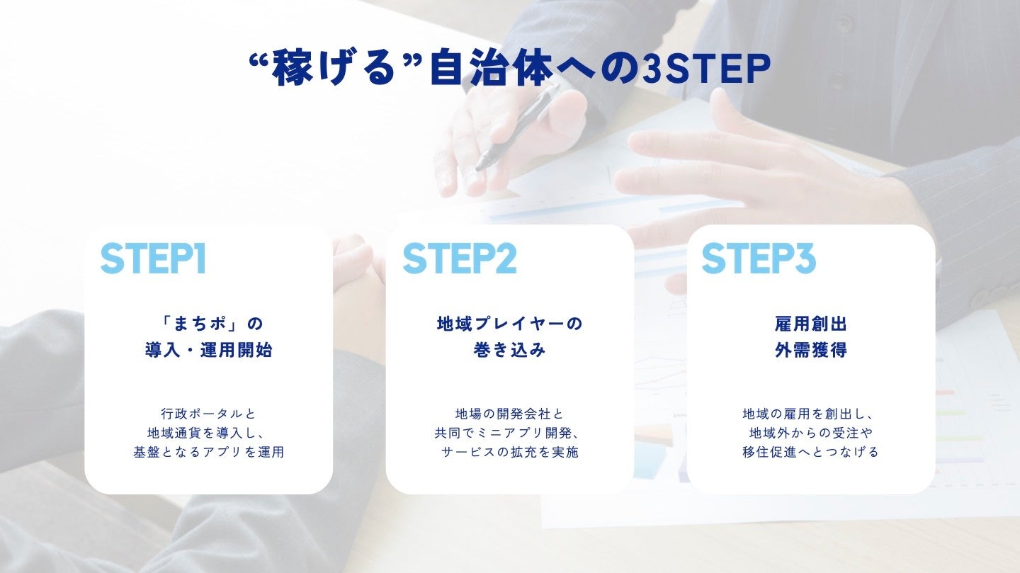 本サービスは単なる行政ポータルとしての機能にとどまらず、地域社会全体の経済循環と人材活用を視野に入れた取り組みとして、以下の3ステップでの展開を推奨しています。