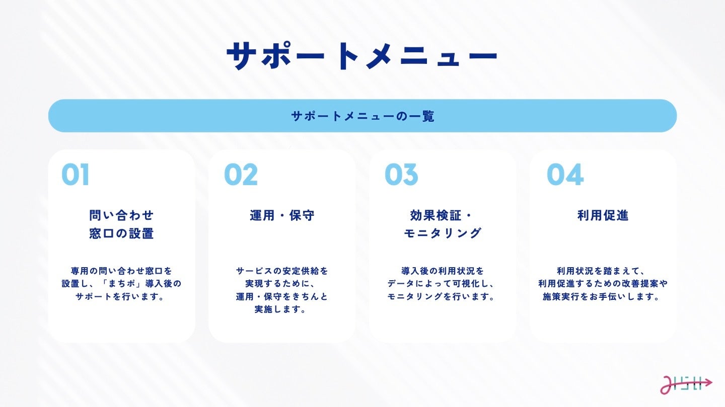 また、導入後のサポートメニューとして、問い合わせ窓口の設置、運用・保守、効果検証・モニタリング、利用促進の支援も提供。地域の特性に合わせたカスタマイズも可能です。