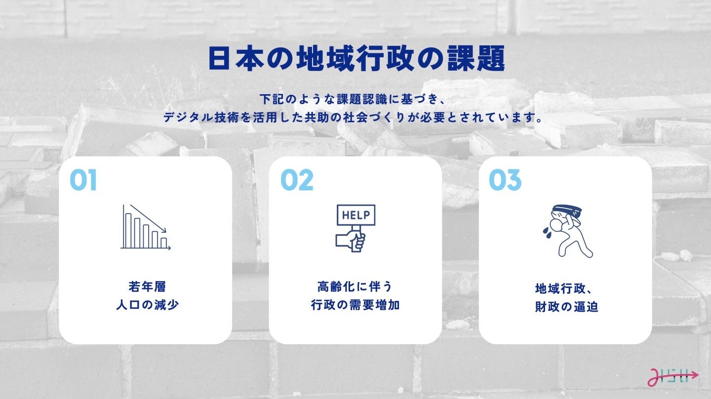 現在、日本の地方自治体は「若年層人口の減少」「高齢化に伴う行政の需要増加」「地域行政、財政の逼迫」という複合的で深刻な課題に直面しています。
