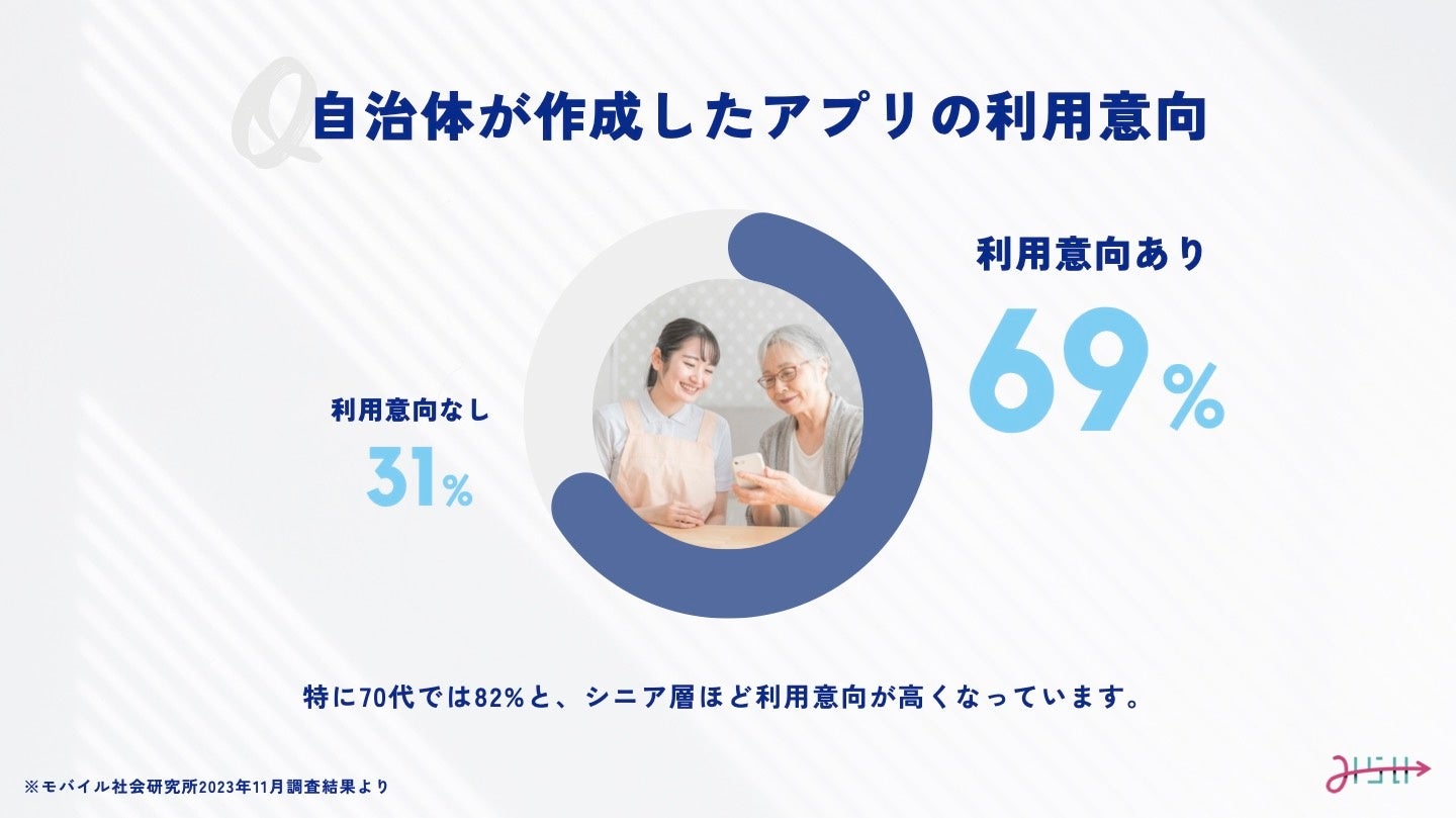 一方で、住民のデジタルサービスに対する期待は年々高まっており、モバイル社会研究所による2023年11月の調査結果によると、自治体が作成したアプリに対する利用意向は69%と高く、特に70代では82%と、シニア層ほど利用意向が高いことが判明。