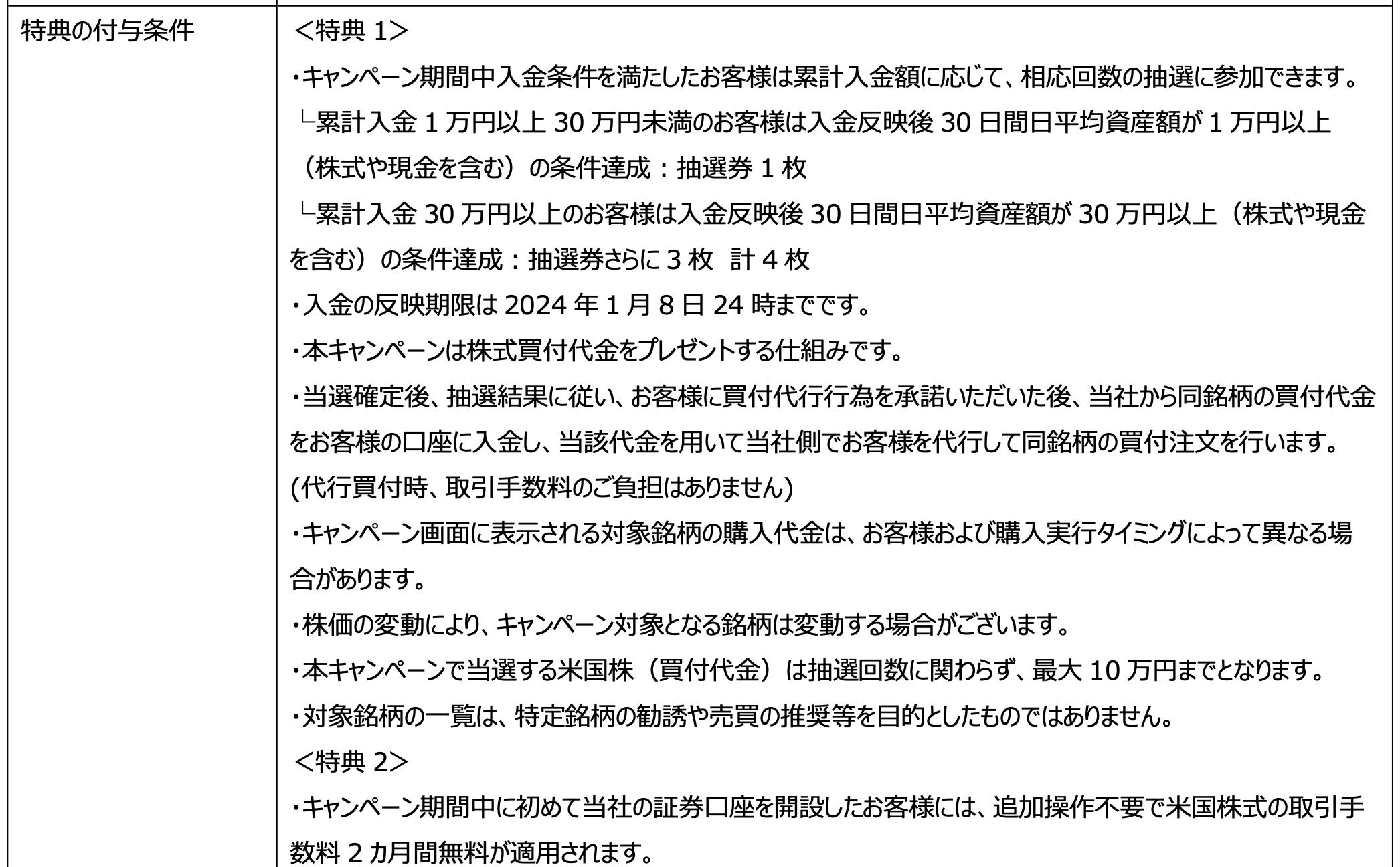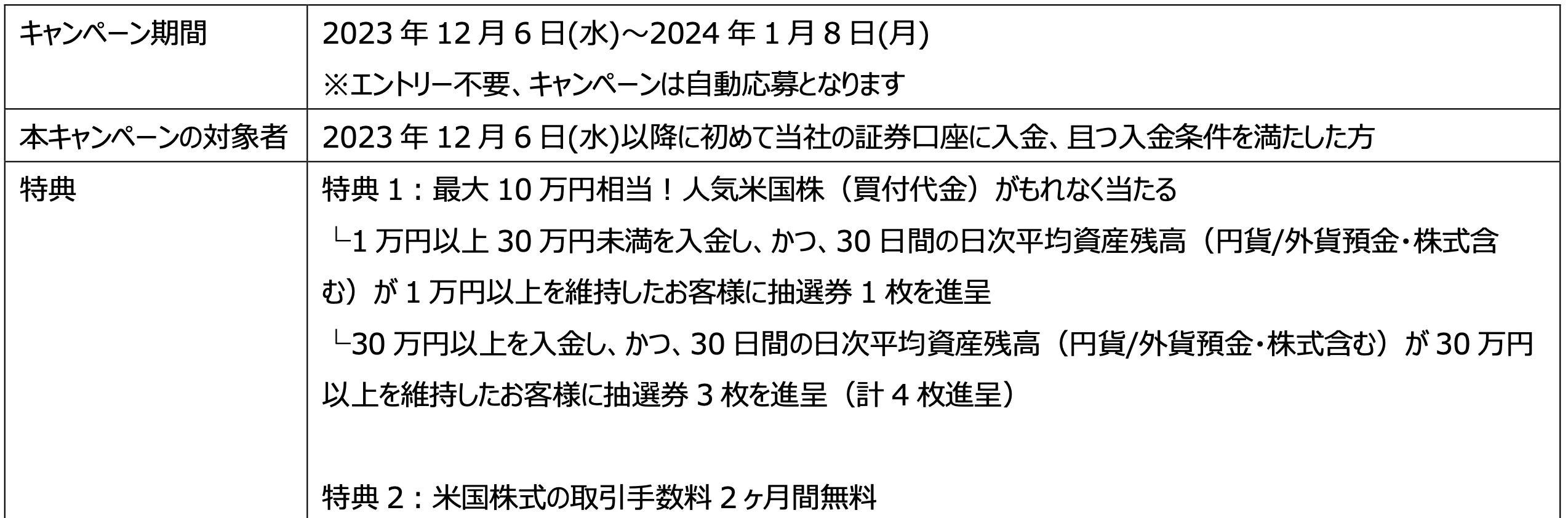 ・本キャンペーンの対象者:①2023年12月6日(水)以降に初めて当社の証券口座に入金、且つ入金条件を満たした方