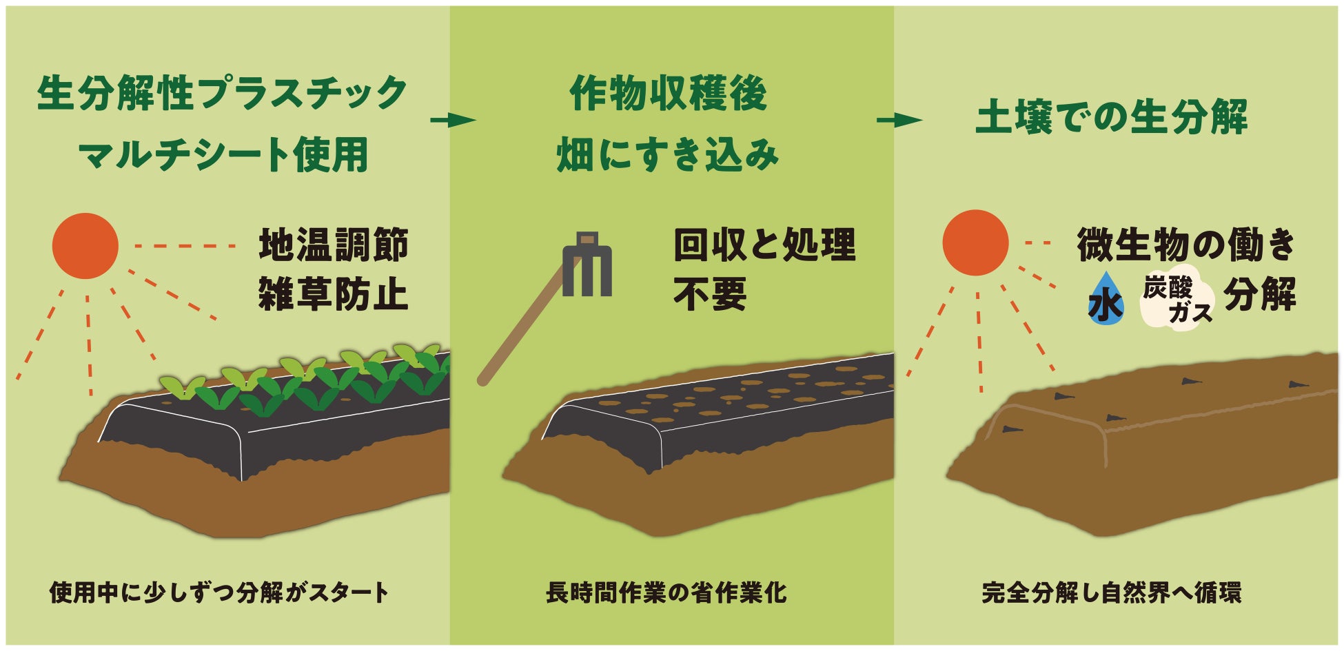 使用されている生分解性プラスチック(PBAT、PLA)は、土中の微生物の働きによって分子レベルまで分解され、最終的には水と二酸化炭素へと自然に還元されます。