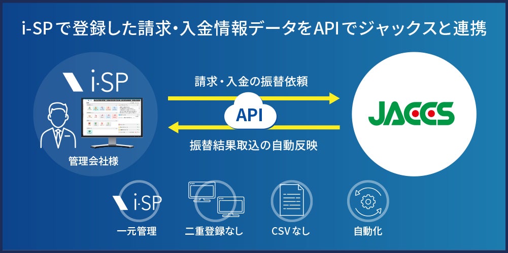 i-SPで登録した請求・入金データをジャックスとAPI連携することによりCSVでのやり取りがなくなる他、i-SPでデータの一元管理を行えるので二重登録がなくなります。また、請求依頼の送信と結果取込が自動で行える為、業務コストの削減が見込めます。
