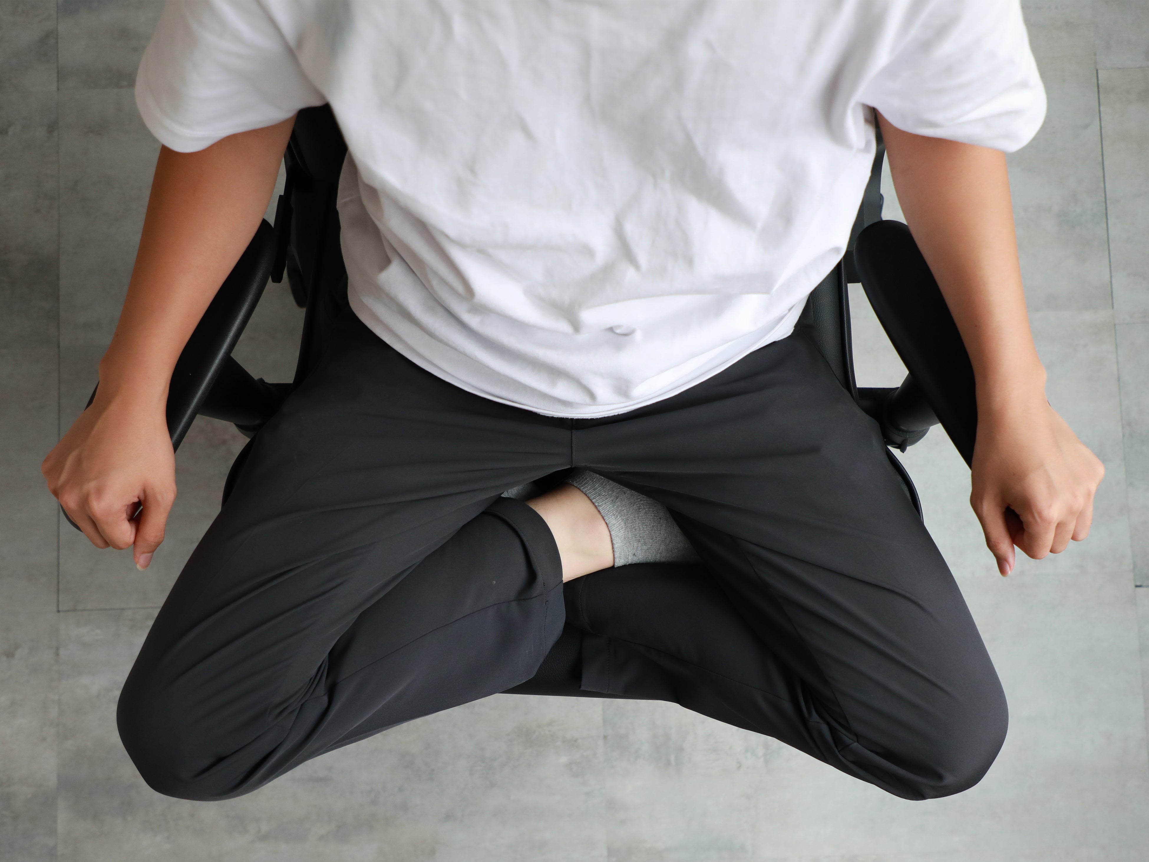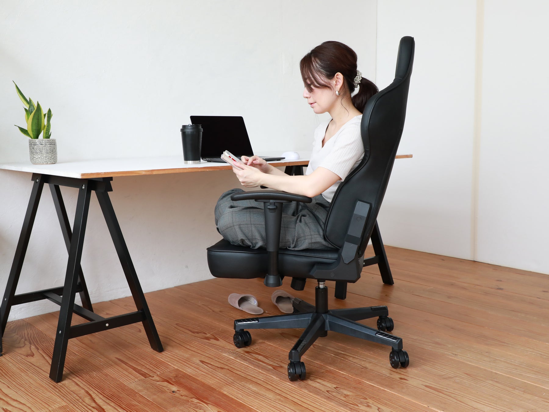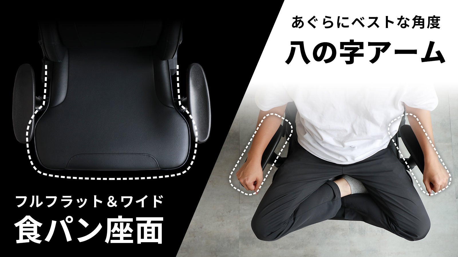 また「あぐらをかく時にアームレストが邪魔になる」問題も、可動式アームレストを『ハの字』に開くことで解決します。