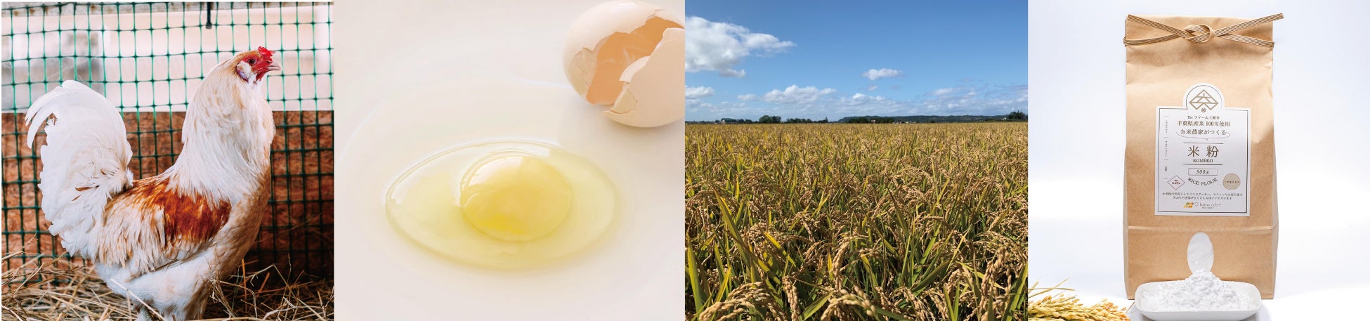 「北海道産クリームチーズケーキ」と「平飼い卵のガトーショコラ」には、”千葉県君津市” にある当社グループ「Theファーム上総介」の農場で栽培した「ミズホチカラ」を自家製粉した『米粉』を使用しています。