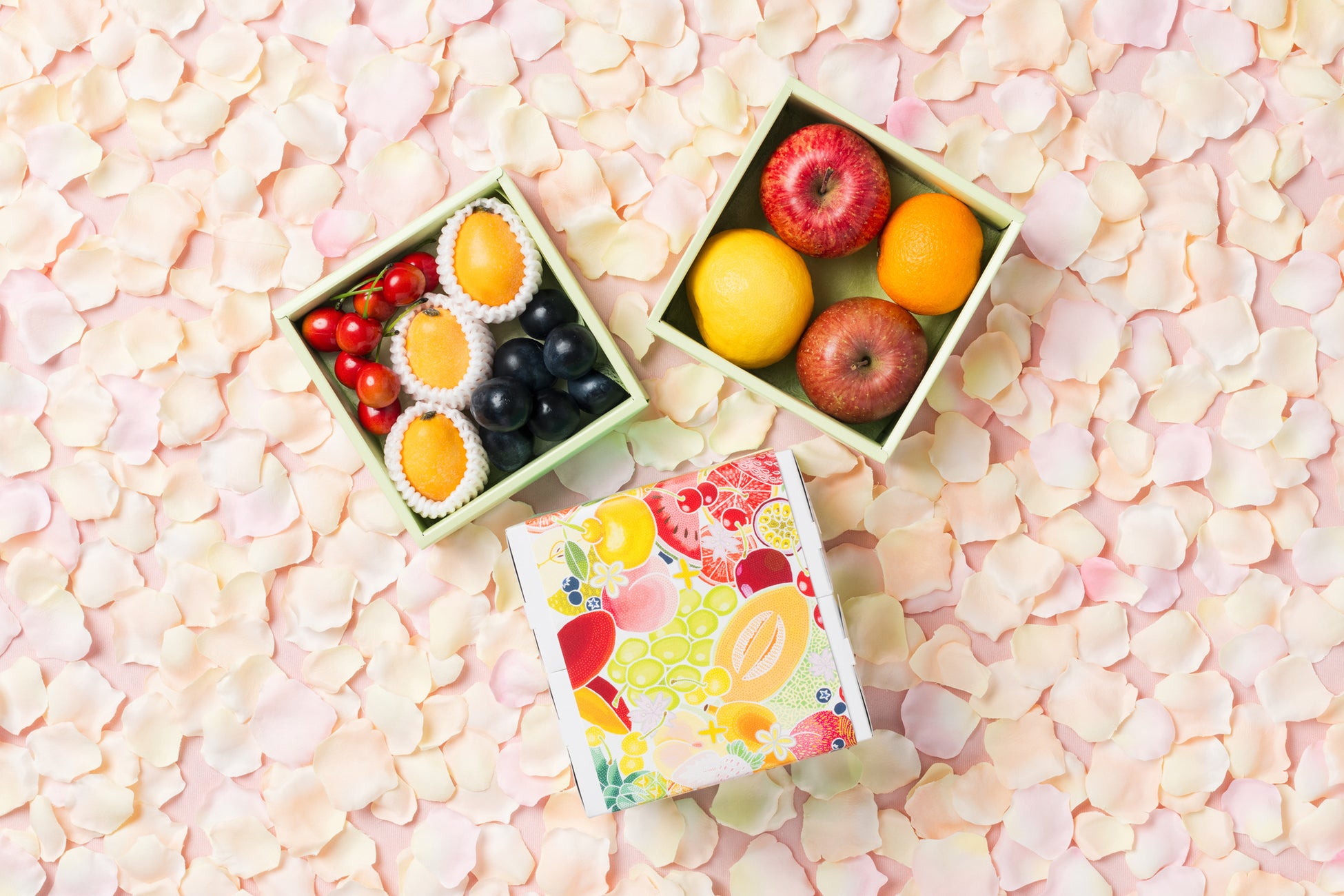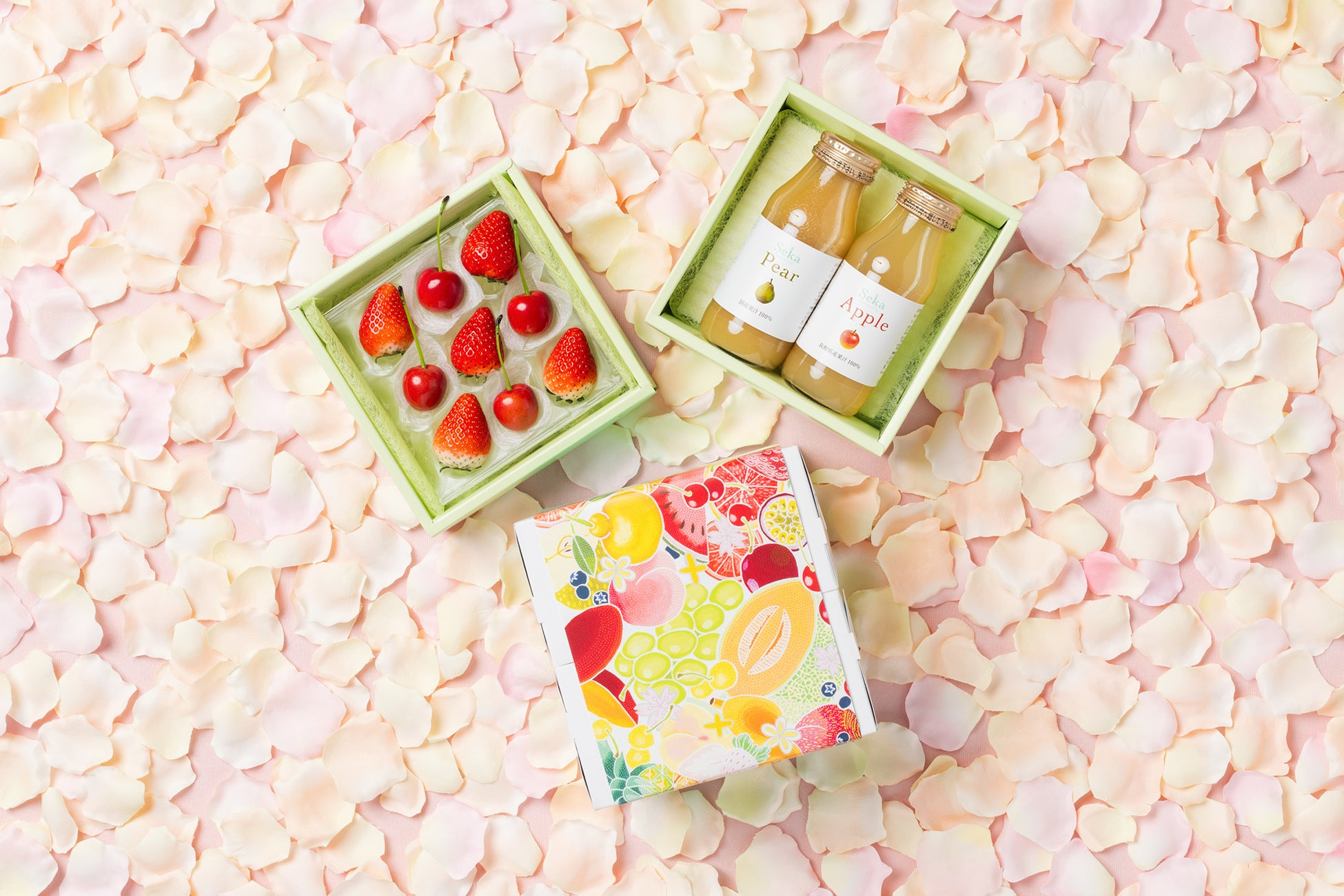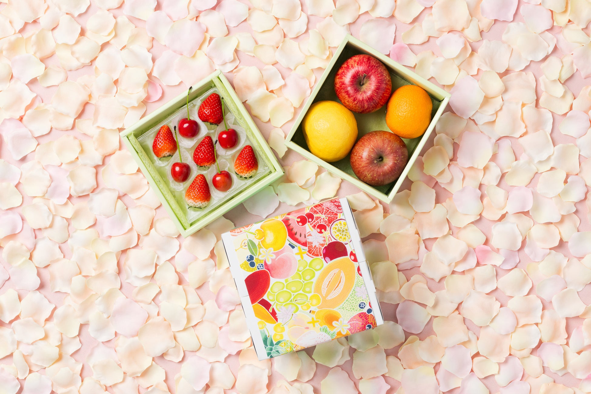上段には山形県産さくらんぼ「佐藤錦」または「紅秀峰」といちごを、下段にはりんごと旬の柑橘を詰め合わせました。
