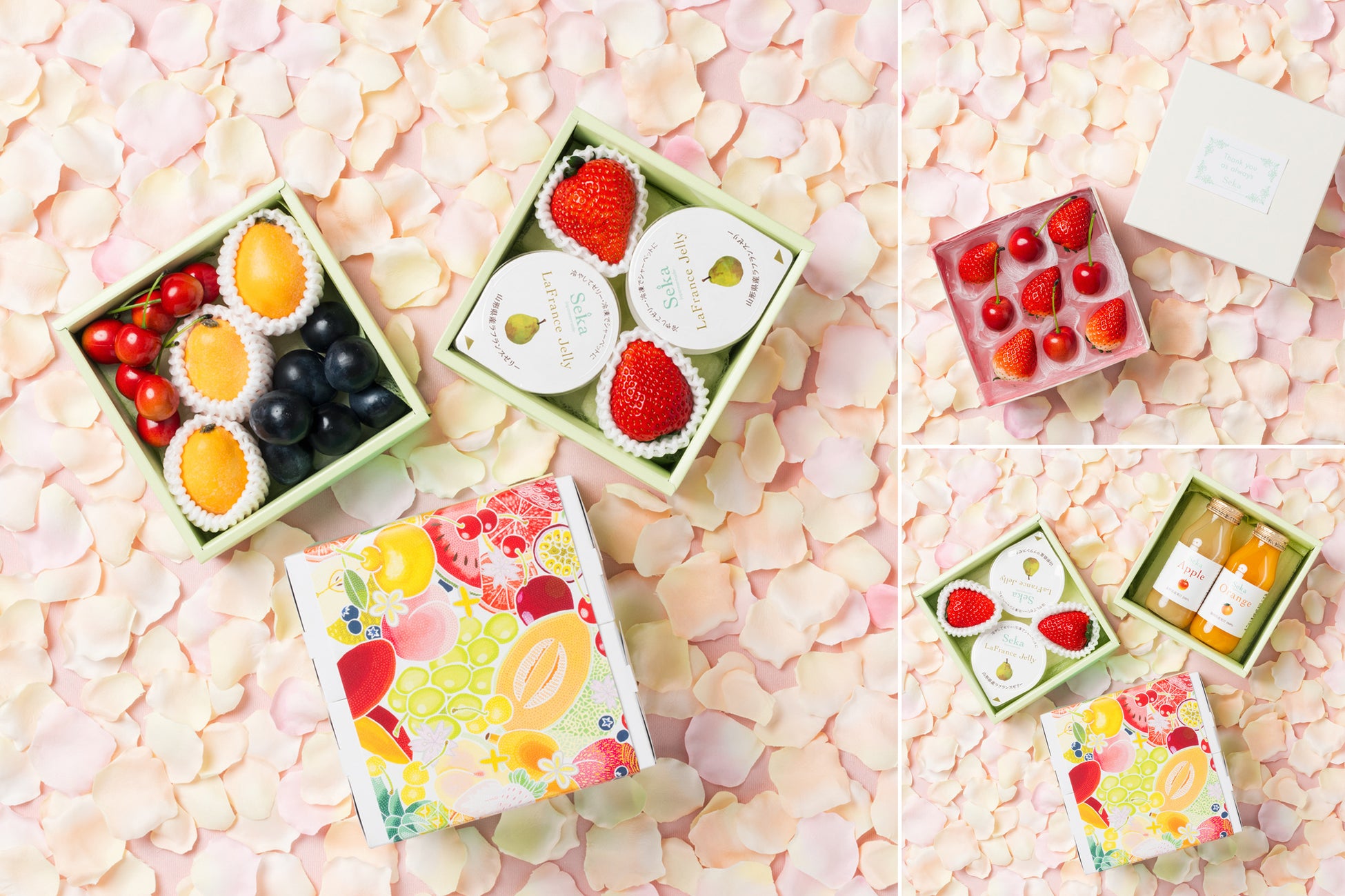 この時期にもおいしくお楽しみいただけるよう厳選した「夏いちご」、どの世代にも人気の高い「黒ぶどう」、山形県産ラフランスの果汁を贅沢に使用した新商品の「山形ラフランスゼリー」をはじめとする、さまざまな組み合わせの中から、お好みやご予算に応じてお選びいただけます。
